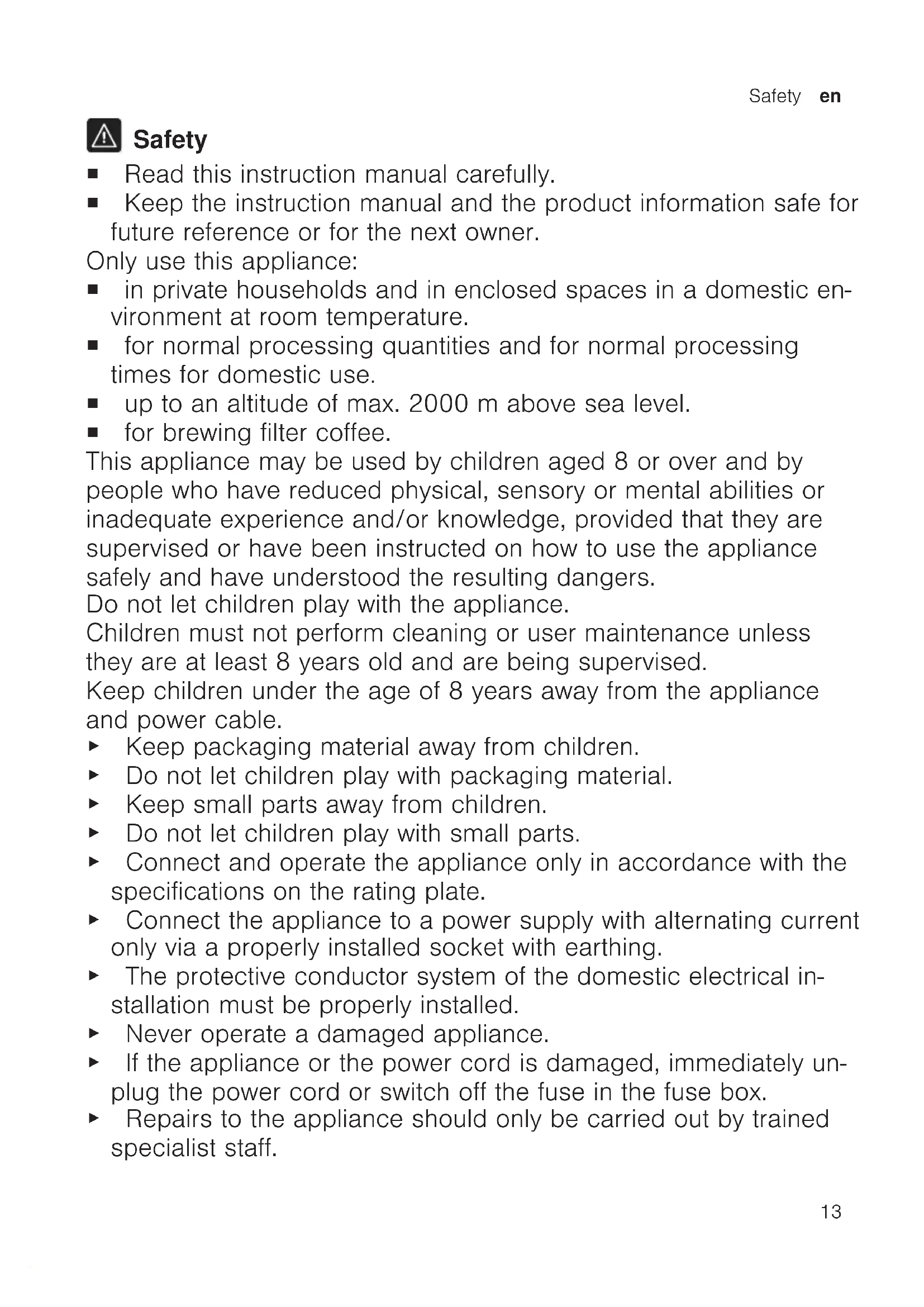 Safety ¡ Read this instruction manual carefully. ¡ Keep the instruction manual and the product information safe for future reference or for the next owner. Only use this appliance: ¡ in private households and in enclosed spaces in a domestic en- vironment at room temperature. ¡ for normal processing quantities and for normal processing times for domestic use. ¡ up to an altitude of max. 2000m above sea level. ¡ for brewing filter coffee. This appliance may be used by children aged 8 or over and by people who have reduced physical, sensory or mental abilities or inadequate experience and/or knowledge, provided that they are supervised or have been instructed on how to use the appliance safely and have understood the resulting dangers. Do not let children play with the appliance. Children must not perform cleaning or user maintenance unless they are at least 8 years old and are being supervised. Keep children under the age of 8 years away from the appliance and power cable. ▶ Keep packaging material away from children. ▶ Do not let children play with packaging material. ▶ Keep small parts away from children. ▶ Do not let children play with small parts. ▶ Connect and operate the appliance only in accordance with the specifications on the rating plate. ▶ Connect the appliance to a power supply with alternating current only via a properly installed socket with earthing. ▶ The protective conductor system of the domestic electrical in- stallation must be properly installed. ▶ Never operate a damaged appliance. ▶ If the appliance or the power cord is damaged, immediately un- plug the power cord or switch off the fuse in the fuse box. ▶ Repairs to the appliance should only be carried out by trained specialist staff.en Preventing material damage