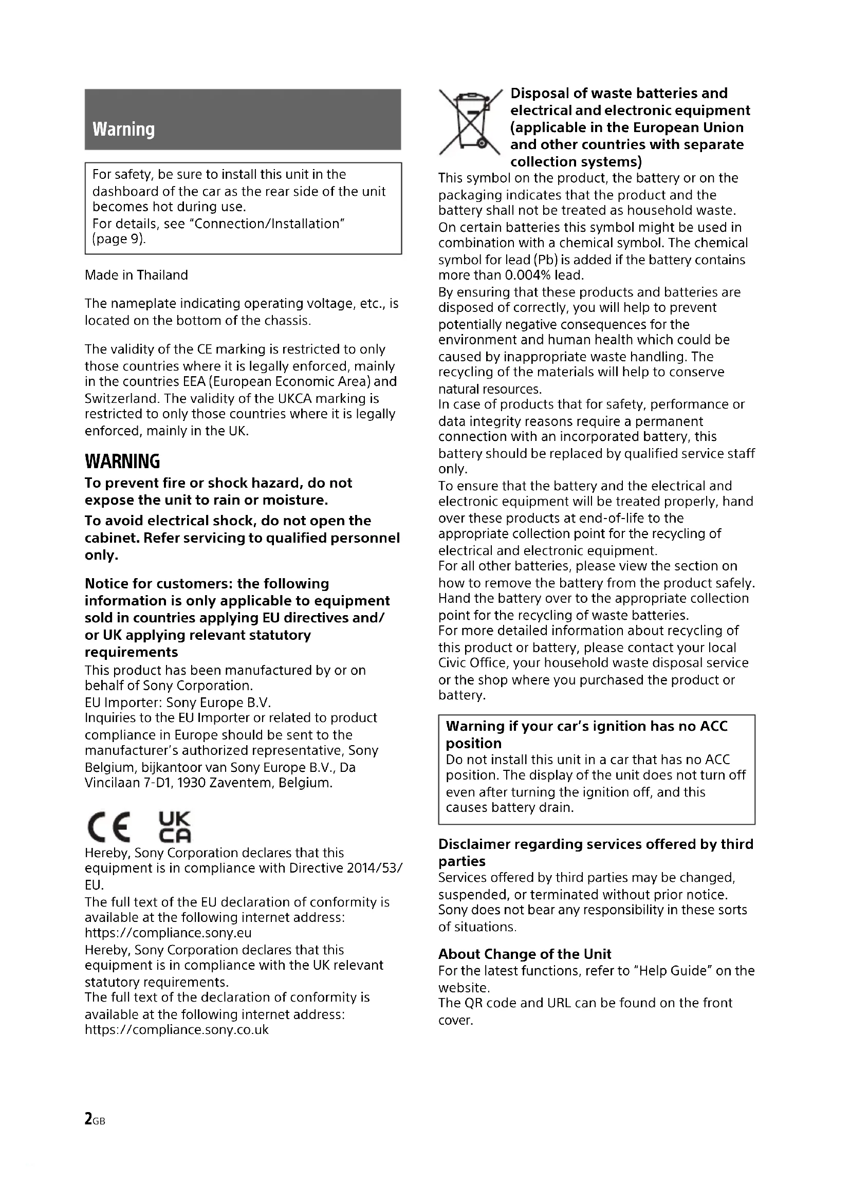Bruksanvisning SE2GB Made in Thailand The nameplate indicating operating voltage, etc., is located on the bottom of the chassis. The validity of the CE marking is restricted to only those countries where it is legally enforced, mainly in the countries EEA (European Economic Area) and Switzerland. The validity of the UKCA marking is restricted to only those countries where it is legally enforced, mainly in the UK. WARNING To prevent fire or shock hazard, do not expose the unit to rain or moisture. To avoid electrical shock, do not open the cabinet. Refer servicing to qualified personnel only. Notice for customers: the following information is only applicable to equipment sold in countries applying EU directives and/ or UK applying relevant statutory requirements This product has been manufactured by or on behalf of Sony Corporation. EU Importer: Sony Europe B.V. Inquiries to the EU Importer or related to product compliance in Europe should be sent to the manufacturer’s authorized representative, Sony Belgium, bijkantoor van Sony Europe B.V., Da Vincilaan 7-D1, 1930 Zaventem, Belgium. Hereby, Sony Corporation declares that this equipment is in compliance with Directive 2014/53/ EU. The full text of the EU declaration of conformity is available at the following internet address: https://compliance.sony.eu Hereby, Sony Corporation declares that this equipment is in compliance with the UK relevant statutory requirements. The full text of the declaration of conformity is available at the following internet address: https://compliance.sony.co.uk Disposal of waste batteries and electrical and electronic equipment (applicable in the European Union and other countries with separate collection systems) This symbol on the product, the battery or on the packaging indicates that the product and the battery shall not be treated as household waste. On certain batteries this symbol might be used in combination with a chemical symbol. The chemical symbol for lead (Pb) is added if the battery contains more than 0.004% lead. By ensuring that these products and batteries are disposed of correctly, you will help to prevent potentially negative consequences for the environment and human health which could be caused by inappropriate waste handling. The recycling of the materials will help to conserve natural resources. In case of products that for safety, performance or data integrity reasons require a permanent connection with an incorporated battery, this battery should be replaced by qualified service staff only. To ensure that the battery and the electrical and electronic equipment will be treated properly, hand over these products at end-of-life to the appropriate collection point for the recycling of electrical and electronic equipment. For all other batteries, please view the section on how to remove the battery from the product safely. Hand the battery over to the appropriate collection point for the recycling of waste batteries. For more detailed information about recycling of this product or battery, please contact your local Civic Office, your household waste disposal service or the shop where you purchased the product or battery. Disclaimer regarding services offered by third parties Services offered by third parties may be changed, suspended, or terminated without prior notice. Sony does not bear any responsibility in these sorts of situations. About Change of the Unit For the latest functions, refer to “Help Guide” on the website. The QR code and URL can be found on the front cover. Warning For safety, be sure to install this unit in the dashboard of the car as the rear side of the unit becomes hot during use. For details, see “Connection/Installation” (page 9). Warning if your car’s ignition has no ACC position Do not install this unit in a car that has no ACC position. The display of the unit does not turn off even after turning the ignition off, and this causes battery drain.3GB Caution IN NO EVENT SHALL SONY BE LIABLE FOR ANY