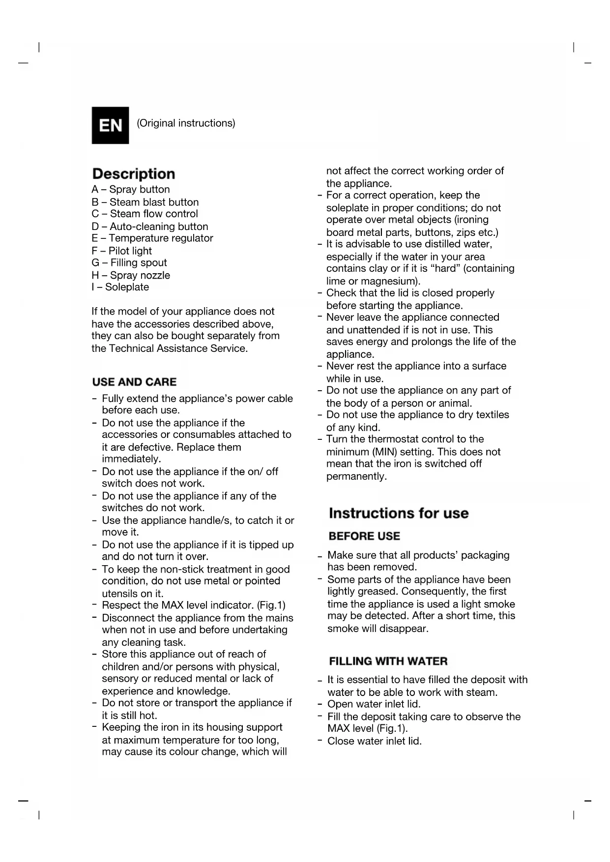 (Original instructions) A – Spray button B – Steam blast button C – Steam flow control D – Auto-cleaning button E – Temperature regulator F – Pilot light G – Filling spout H – Spray nozzle I – Soleplate If the model of your appliance does not have the accessories described above, they can also be bought separately from the Technical Assistance Service.