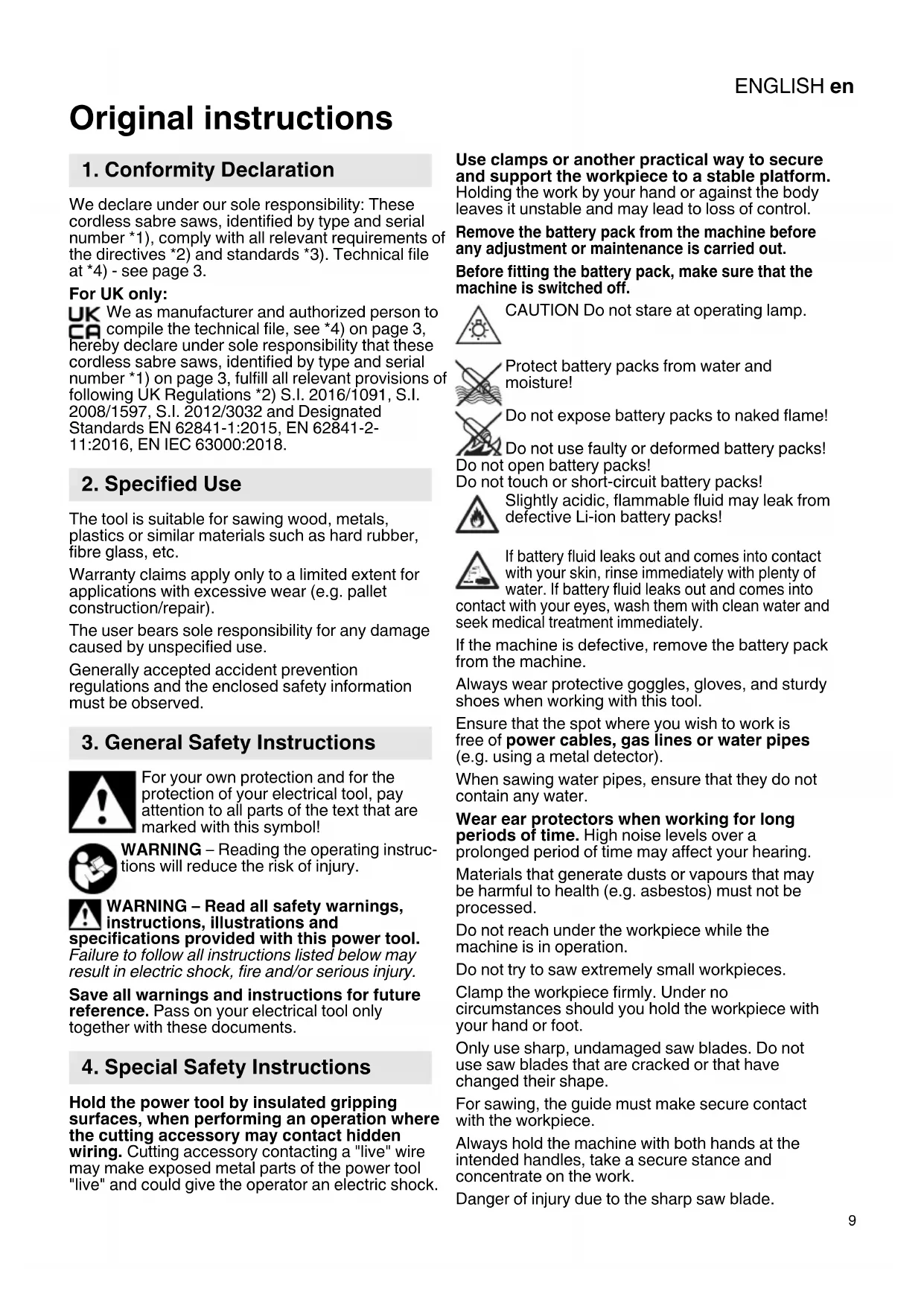 Original instructions We declare under our sole responsibility: These cordless sabre saws, identified by type and serial number *1), comply with all relevant requirements of the directives *2) and standards *3). Technical file at *4) - see page 3. For UK only: We as manufacturer and authorized person to compile the technical file, see *4) on page 3, hereby declare under sole responsibility that these cordless sabre saws, identified by type and serial number *1) on page 3, fulfill all relevant provisions of following UK Regulations *2) S.I. 2016/1091, S.I. 2008/1597, S.I. 2012/3032 and Designated Standards EN 62841-1:2015, EN 62841-2- 11:2016, EN IEC 63000:2018. The tool is suitable for sawing wood, metals, plastics or similar materials such as hard rubber, fibre glass, etc. Warranty claims apply only to a limited extent for applications with excessive wear (e.g. pallet construction/repair). The user bears sole responsibility for any damage caused by unspecified use. Generally accepted accident prevention regulations and the enclosed safety information must be observed. For your own protection and for the protection of your electrical tool, pay attention to all parts of the text that are marked with this symbol! WARNING – Reading the operating instruc- tions will reduce the risk of injury. WARNING – Read all safety warnings, instructions, illustrations and specifications provided with this power tool. Failure to follow all instructions listed below may result in electric shock, fire and/or serious injury. Save all warnings and instructions for future reference. Pass on your electrical tool only together with these documents. Hold the power tool by insulated gripping surfaces, when performing an operation where the cutting accessory may contact hidden wiring. Cutting accessory contacting a "live" wire may make exposed metal parts of the power tool "live" and could give the operator an electric shock. Use clamps or another practical way to secure and support the workpiece to a stable platform. Holding the work by your hand or against the body leaves it unstable and may lead to loss of control. Remove the battery pack from the machine before any adjustment or maintenance is carried out. Before fitting the battery pack, make sure that the machine is switched off. CAUTION Do not stare at operating lamp. Protect battery packs from water and moisture! Do not expose battery packs to naked flame! Do not use faulty or deformed battery packs! Do not open battery packs! Do not touch or short-circuit battery packs! Slightly acidic, flammable fluid may leak from defective Li-ion battery packs! If battery fluid leaks out and comes into contact with your skin, rinse immediately with plenty of water. If battery fluid leaks out and comes into contact with your eyes, wash them with clean water and seek medical treatment immediately. If the machine is defective, remove the battery pack from the machine. Always wear protective goggles, gloves, and sturdy shoes when working with this tool. Ensure that the spot where you wish to work is free of power cables, gas lines or water pipes (e.g. using a metal detector). When sawing water pipes, ensure that they do not contain any water. Wear ear protectors when working for long periods of time. High noise levels over a prolonged period of time may affect your hearing. Materials that generate dusts or vapours that may be harmful to health (e.g. asbestos) must not be processed. Do not reach under the workpiece while the machine is in operation. Do not try to saw extremely small workpieces. Clamp the workpiece firmly. Under no circumstances should you hold the workpiece with your hand or foot. Only use sharp, undamaged saw blades. Do not use saw blades that are cracked or that have changed their shape. For sawing, the guide must make secure contact with the workpiece. Always hold the machine with both hands at the intended handles, take a secure stance and concentrate on the work. Danger of injury due to the sharp saw blade.