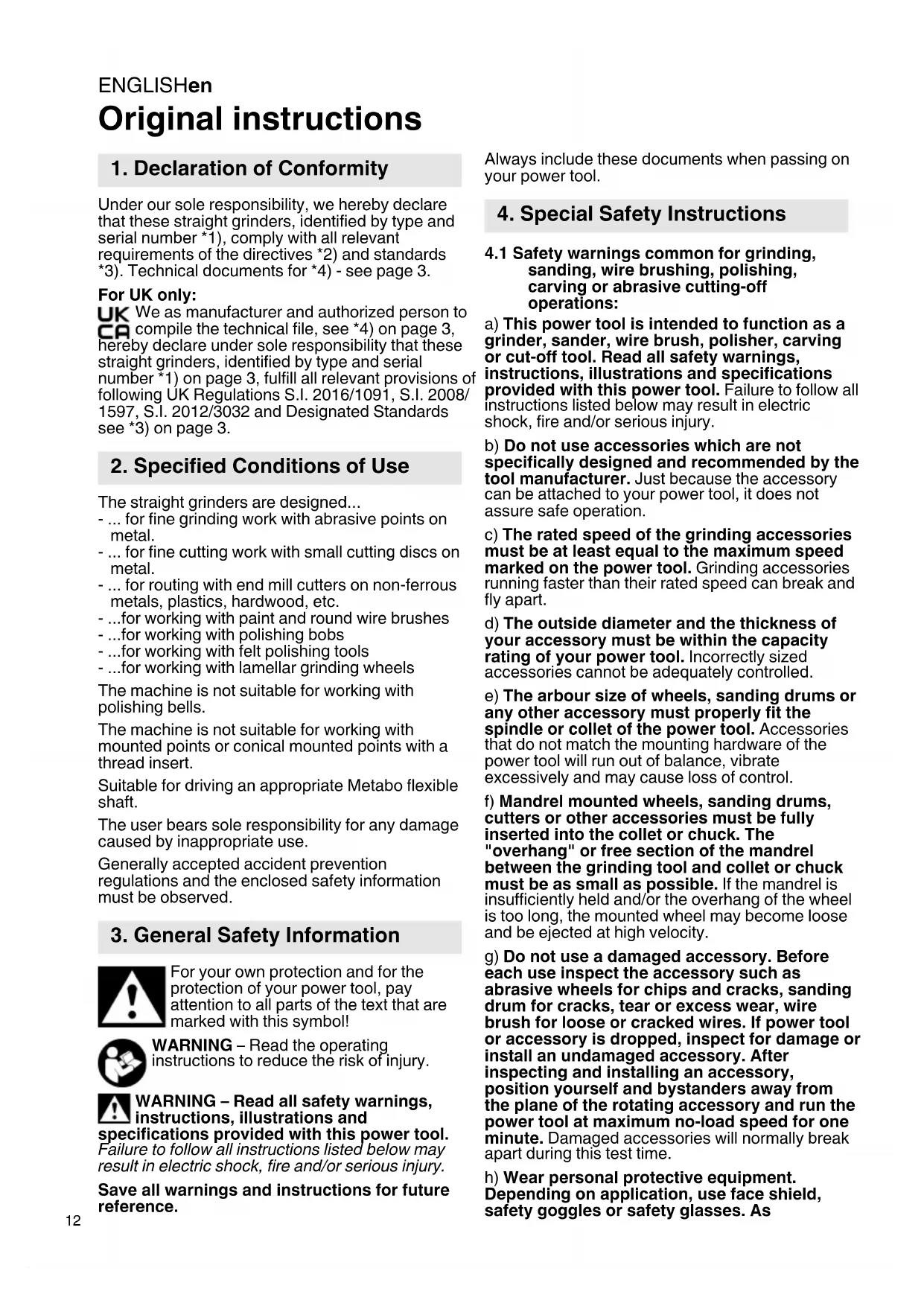 Original instructions Under our sole responsibility, we hereby declare that these straight grinders, identified by type and serial number *1), comply with all relevant requirements of the directives *2) and standards *3). Technical documents for *4) - see page 3. For UK only: We as manufacturer and authorized person to compile the technical file, see *4) on page 3, hereby declare under sole responsibility that these straight grinders, identified by type and serial number *1) on page 3, fulfill all relevant provisions of following UK Regulations S.I. 2016/1091, S.I. 2008/ 1597, S.I. 2012/3032 and Designated Standards see *3) on page 3. The straight grinders are designed... - ... for fine grinding work with abrasive points on metal. - ... for fine cutting work with small cutting discs on metal. - ... for routing with end mill cutters on non-ferrous metals, plastics, hardwood, etc. - ...for working with paint and round wire brushes - ...for working with polishing bobs - ...for working with felt polishing tools - ...for working with lamellar grinding wheels The machine is not suitable for working with polishing bells. The machine is not suitable for working with mounted points or conical mounted points with a thread insert. Suitable for driving an appropriate Metabo flexible shaft. The user bears sole responsibility for any damage caused by inappropriate use. Generally accepted accident prevention regulations and the enclosed safety information must be observed. For your own protection and for the protection of your power tool, pay attention to all parts of the text that are marked with this symbol! WARNING – Read the operating instructions to reduce the risk of injury. WARNING – Read all safety warnings, instructions, illustrations and specifications provided with this power tool. Failure to follow all instructions listed below may result in electric shock, fire and/or serious injury. Save all warnings and instructions for future reference. Always include these documents when passing on your power tool.