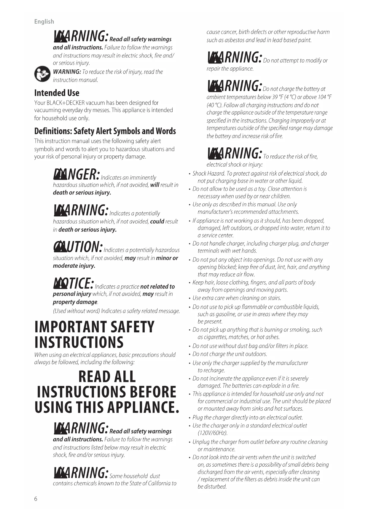 NOTICE: Indicates a practice not related to personal injury which, if not avoided, may result in propertydamage. (Used without word) Indicates a safety relatedmessage. Intended Use Your BLACK+DECKER vacuum has been designed for vacuuming everyday dry messes. This appliance is intended for household useonly. English (original instructions)
