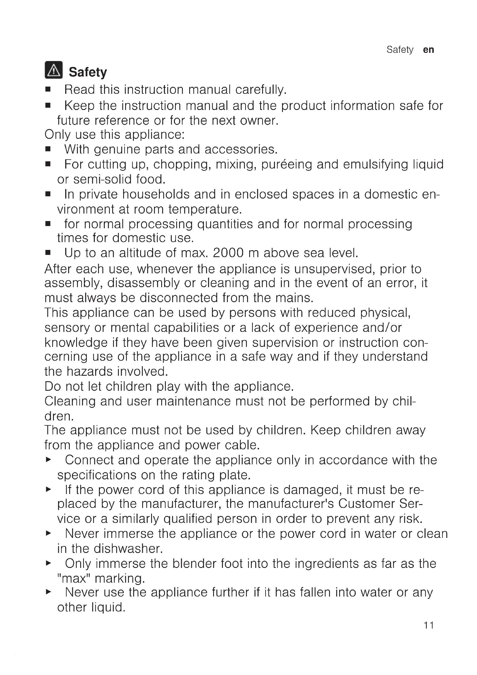 Safety ¡ Read this instruction manual carefully. ¡ Keep the instruction manual and the product information safe for future reference or for the next owner. Only use this appliance: ¡ With genuine parts and accessories. ¡ For cutting up, chopping, mixing, puréeing and emulsifying liquid or semi-solid food. ¡ In private households and in enclosed spaces in a domestic en- vironment at room temperature. ¡ for normal processing quantities and for normal processing times for domestic use. ¡ Up to an altitude of max. 2000m above sea level. After each use, whenever the appliance is unsupervised, prior to assembly, disassembly or cleaning and in the event of an error, it must always be disconnected from the mains. This appliance can be used by persons with reduced physical, sensory or mental capabilities or a lack of experience and/or knowledge if they have been given supervision or instruction con- cerning use of the appliance in a safe way and if they understand the hazards involved. Do not let children play with the appliance. Cleaning and user maintenance must not be performed by chil- dren. The appliance must not be used by children. Keep children away from the appliance and power cable. ▶ Connect and operate the appliance only in accordance with the specifications on the rating plate. ▶ If the power cord of this appliance is damaged, it must be re- placed by the manufacturer, the manufacturer's Customer Ser- vice or a similarly qualified person in order to prevent any risk. ▶ Never immerse the appliance or the power cord in water or clean in the dishwasher. ▶ Only immerse the blender foot into the ingredients as far as the "max" marking. ▶ Never use the appliance further if it has fallen into water or any other liquid.en Avoiding material damage