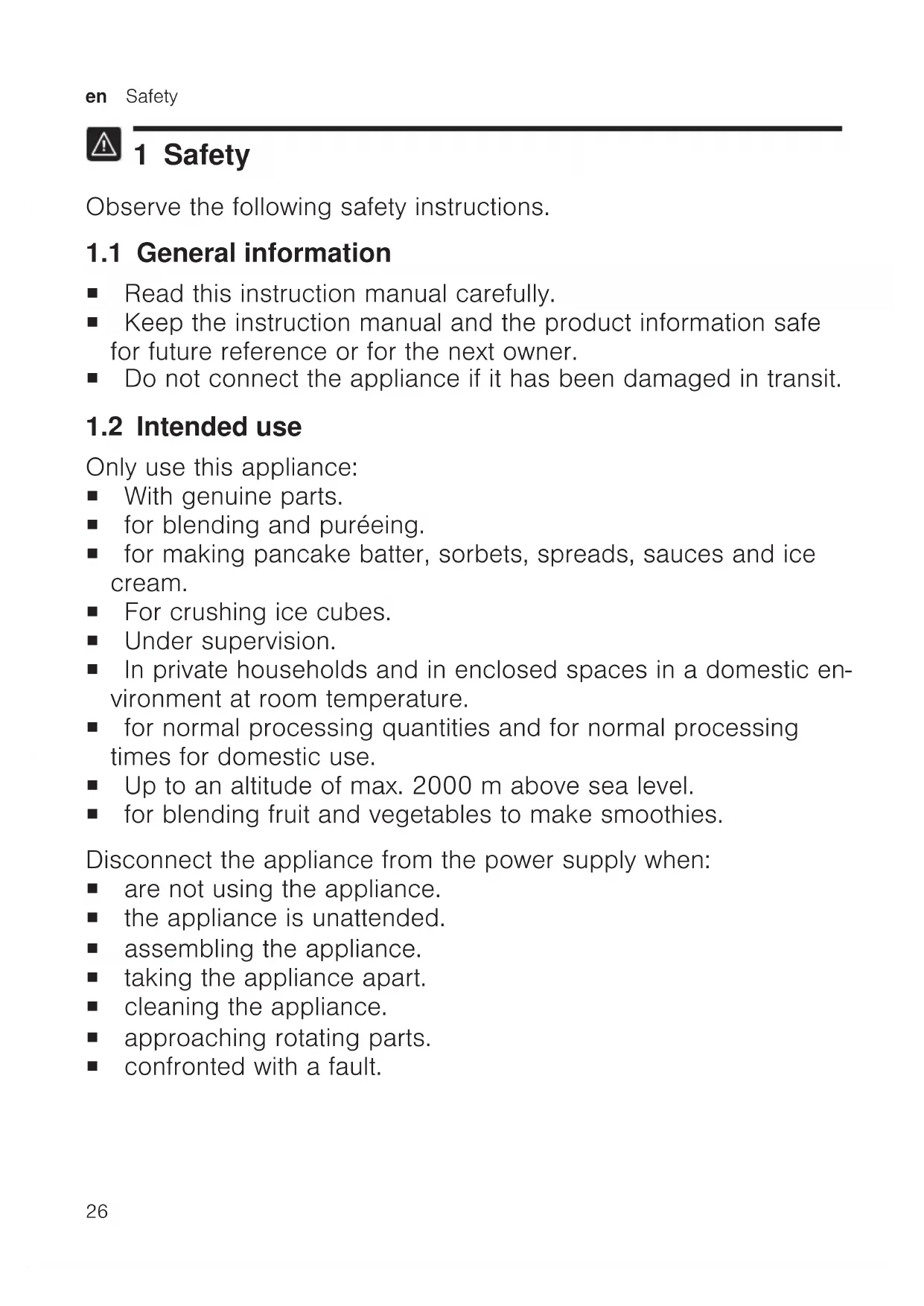 1 Safety Observe the following safety instructions. 1.1 General information ¡ Read this instruction manual carefully. ¡ Keep the instruction manual and the product information safe for future reference or for the next owner. ¡ Do not connect the appliance if it has been damaged in transit. 1.2 Intended use Only use this appliance: ¡ With genuine parts. ¡ for blending and puréeing. ¡ for making pancake batter, sorbets, spreads, sauces and ice cream. ¡ For crushing ice cubes. ¡ Under supervision. ¡ In private households and in enclosed spaces in a domestic en- vironment at room temperature. ¡ for normal processing quantities and for normal processing times for domestic use. ¡ Up to an altitude of max. 2000m above sea level. ¡ for blending fruit and vegetables to make smoothies. Disconnect the appliance from the power supply when: ¡ are not using the appliance. ¡ the appliance is unattended. ¡ assembling the appliance. ¡ taking the appliance apart. ¡ cleaning the appliance. ¡ approaching rotating parts. ¡ confronted with a fault.Safety en