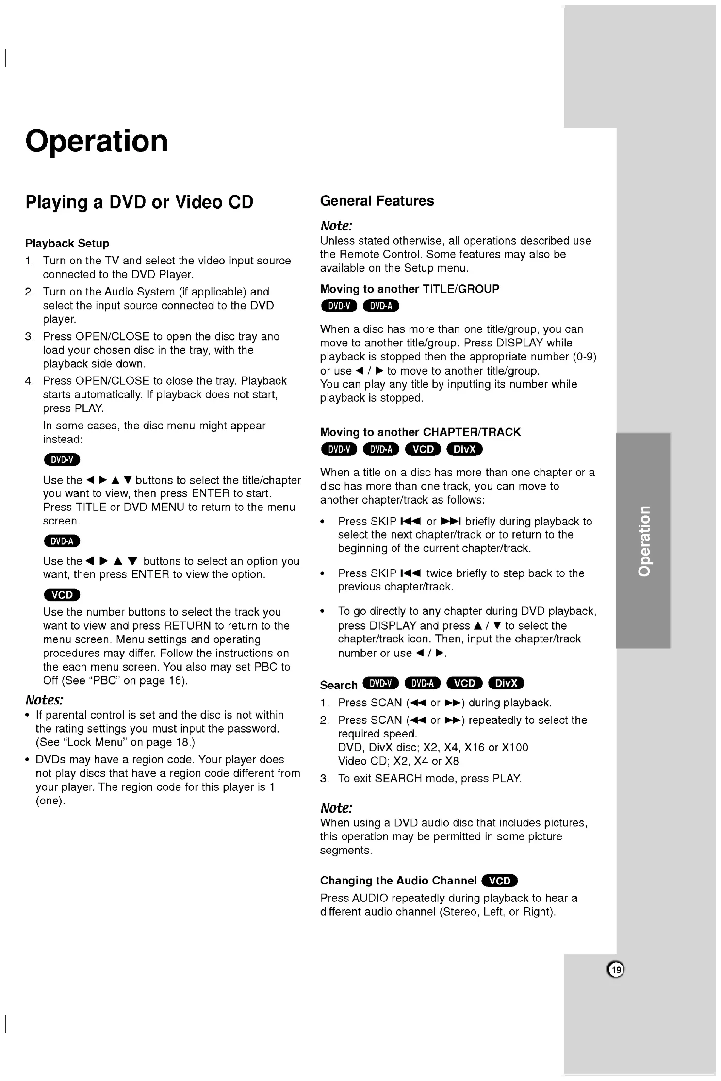 thesoftware manufacturer, thereforesome playback features may notbeavailableorotherfunctions may beadded. Manufactured under license from Dolby Laboratories. "Dolby", "Pro Logic", and the double-D symbol are trademarks Dolby Laboratories. DTS and DTS Surround Out are trademarks Digital Theater Systems, Inc. Regional code ThisDVD player designed andmanufacturedfor playback region "1"encodedDVDsoftware.Thisunitcan play only DVDdiscslabeled"1"or"ALL". Notes Regional Codes ?MostDVDdiscshavea globe withoneormorenumbersinit clearly visibleonthecover.Thisnumbermustmatch your DVD player's regional codeorthedisccannot play. ?If you try play aDVDwithadifferent region codefrom your player, the message "Check Regional Code" appears ontheTVscreen. Notes Copyrights: Itisforbidden lawto copy, broadcast, show, broadcastvia cable, play public, orrent copyrighted materialwithout permission. This product featuresthe copy protection function developed