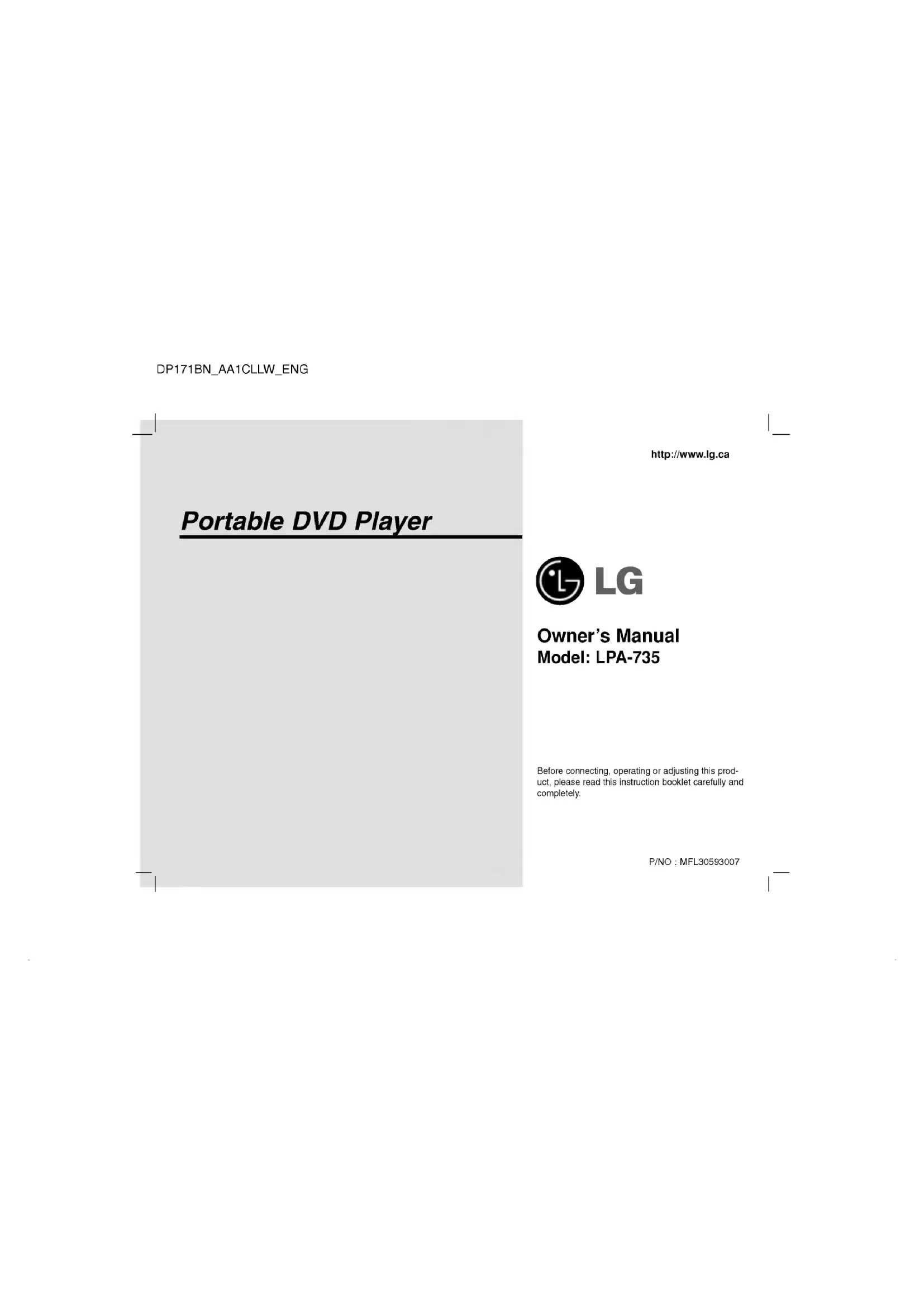 Portable DVD Player Beforeconnecting,operatingoradjustingthisprod-uct,pleasereadthisinstructionbookletcarefullyandcompletely. Owner's Manual Model:LPA-735P/NO MFL30593007