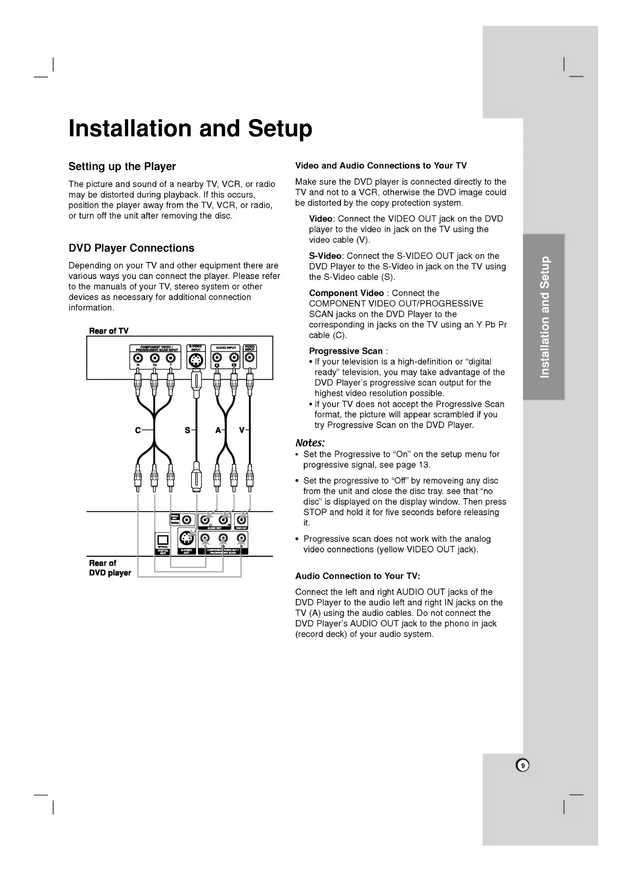 Aspect Widescreen 16:9 Display Mode Off Progressive Scan Move Select13 Installation and Setup Progressive Scan Progressive ScanVideo provides the highest quality pictures with less flickering. you are using the Component Video jacks forconnectiontoaTVormonitorthatis compatible witha progressive scan signal, set Progressive ScantoOn.ToTurnON progressive scan:Connect component outoftheDVDtothe input your monitor/television, set your televisionormonitorto Component Input.