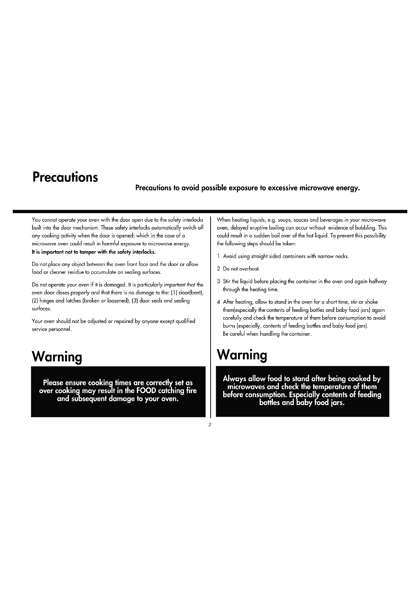 MICROWAVE OVEN PLEASE READ THIS OWNER’S MANUAL THOROUGHLY BEFORE OPERATING. ENGLISH FRENCH MFL67571201You cannot operate your oven with the door open due to the safety interlocks built into the door mechanism. These safety interlocks automatically switch off any cooking activity when the door is opened; which in the case of a microwave oven could result in harmful exposure to microwave energy. It is important not to tamper with the safety interlocks. Do not place any object between the oven front face and the door or allow food or cleaner residue to accumulate on sealing surfaces. Do not operate your oven if it is damaged. It is particularly important that the oven door closes properly and that there is no damage to the: (1) door(bent), (2) hinges and latches (broken or loosened), (3) door seals and sealing surfaces. Your oven should not be adjusted or repaired by anyone except qualified service personnel. Warning Precautions to avoid possible exposure to excessive microwave energy. Precautions When heating liquids, e.g. soups, sauces and beverages in your microwave oven, delayed eruptive boiling can occur without evidence of bubbling. This could result in a sudden boil over of the hot liquid. To prevent this possibility the following steps should be taken: 1 Avoid using straight sided containers with narrow necks. 2 Do not overheat. 3 Stir the liquid before placing the container in the oven and again halfway through the heating time. 4 After heating, allow to stand in the oven for a short time, stir or shake them(especially the contents of feeding bottles and baby food jars) again carefully and check the temperature of them before consumption to avoid burns (especially, contents of feeding bottles and baby food jars). Be careful when handling the container. Warning Always allow food to stand after being cooked by microwaves and check the temperature of them before consumption. Especially contents of feeding bottles and baby food jars. Please ensure cooking times are correctly set as over cooking may result in the FOOD catching fire and subsequent damage to your oven. How the Microwave Oven Works Microwaves are a form of energy similar to radio and television waves and ordinary daylight. Normally, microwaves spread outwards as they travel through the atmosphere and disappear without effect. Microwave ovens, however, have a magnetron which is designed to make use of the energy in microwaves. Electricity, supplied to the magnetron tube, is used to created microwave energy. These microwaves enter the cooking area through openings inside the oven. A turntable or tray is located at the bottom of the oven. Microwaves cannot pass through metal walls of the oven, but they can penetrate such materials as glass, porcelain and paper, the materials out of which microwave-safe cooking dishes are constructed. Microwaves do not heat cookware, though cooking vessels will eventually get hot from the heat generated by the food. A very safe appliance Your microwave oven is one of the safest of all home appliances. When the door is opened, the oven automatically stops producing microwaves. Microwave energy is converted completely to heat when it enters food, leaving no “left over” energy to harm you when you eat your food. Contents