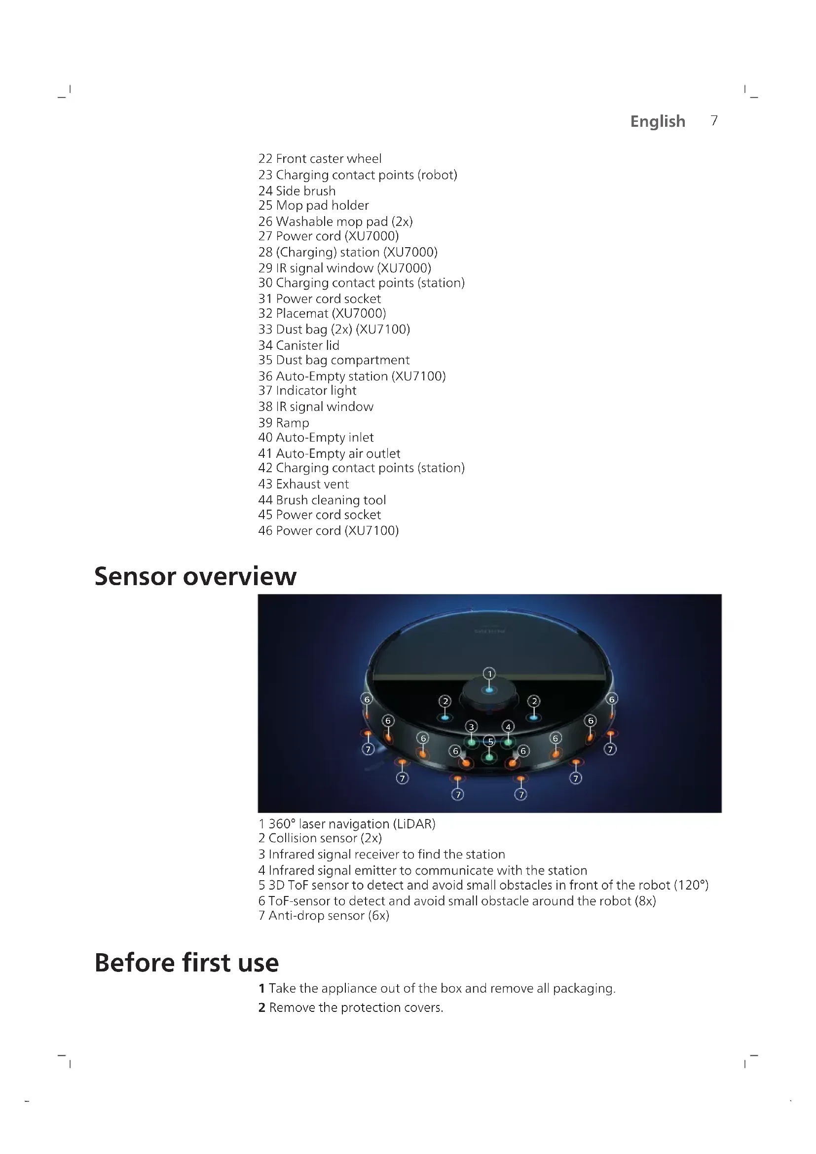 1 360° laser navigation (LiDAR) 2 Collision sensor (2x) 3 Infrared signal receiver to find the station 4 Infrared signal emitter to communicate with the station 5 3D ToF sensor to detect and avoid small obstacles in front of the robot (120°) 6 ToF-sensor to detect and avoid small obstacle around the robot (8x) 7 Anti-drop sensor (6x) Before first use 1 Take the appliance out of the box and remove all packaging. 2 Remove the protection covers.8 English 3 If you see any sign of visible damage, go to www.philips.com/support or contact the Consumer Care Center in your country. Install and fill the water tank