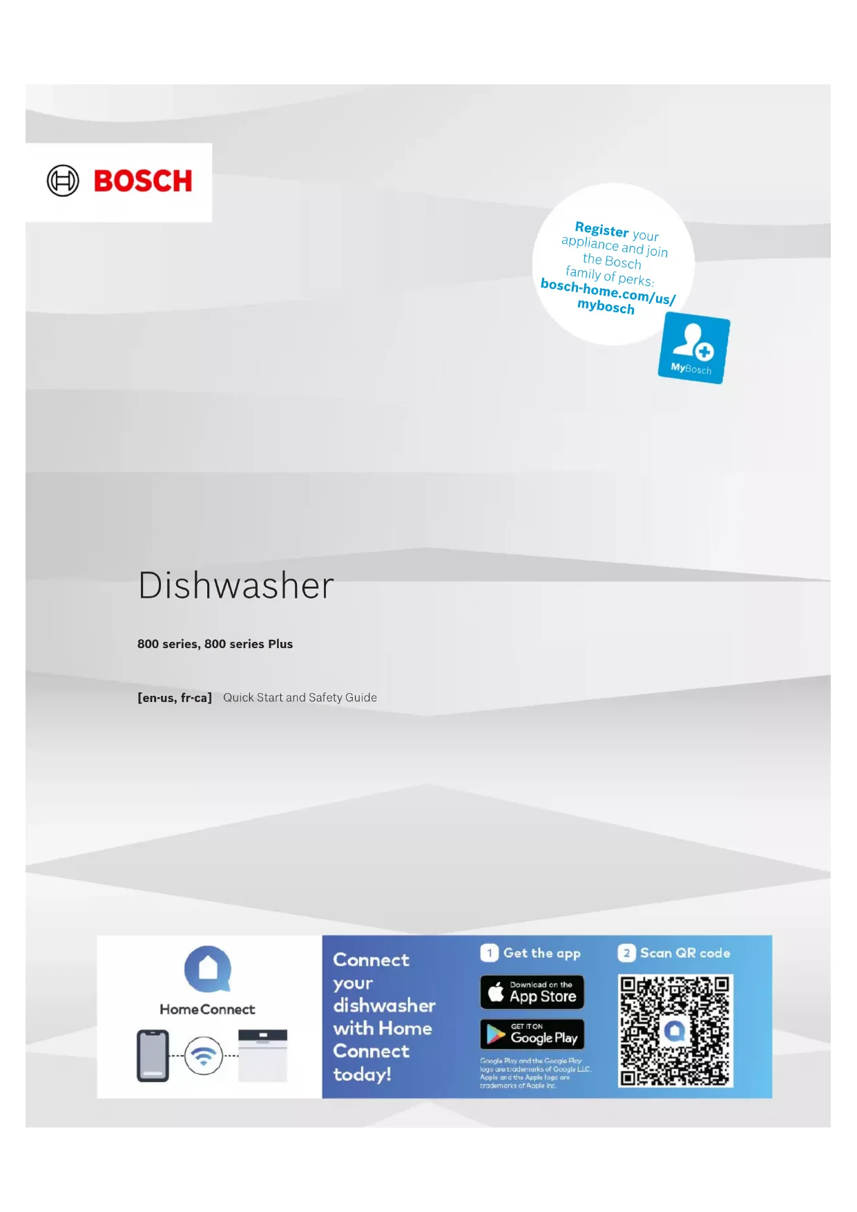 Register your appliance and join the Bosch family of perks: bosch-home.com/us/ mybosch Dishwasher 800 series, 800 series Plus [en-us, fr-ca] Quick Start and Safety Guideen-us Read all instructions carefully before use. These precau- tions will reduce the risk of electrical shock, fire and injury to persons. When using kitchen appliances, basic safety precautions must be followed including those in the follow- ing pages. 1.1 Safety definitions Here you can find explanations of the safety signal words used in this manual. WARNING This indicates that death or serious injuries may occur as a result of non-observance of this warning. CAUTION This indicates that minor or moderate injuries may occur as a result of non-observance of this warning. NOTICE: This indicates that damage to the appliance or property may occur as a result of non-compliance with this advi- sory. Note:This alerts you to important information and/or tips. 1.2 General information To reduce the risk of fire, electrical shock, or serious in- jury, observe the following. ¡ Read and understand all instructions before using the appliance. ¡ Keep the provided documents in a safe place for future reference or for the next owner. ¡ Do not connect the appliance if it has been damaged in transit. ¡ Severe product damage and/or injury could result from the use of unqualified service technicians or non-origi- nal parts. All repairs must be performed by an autho- rized service provider using only original equipment fac- tory replacement parts. ¡ NSF/ANSI 184 Certified residential dishwashers are not intended for licensed food establishments. 1.3 Intended use Only use this appliance: ¡ for cleaning household dishware. ¡ In private households and in enclosed spaces in a resi- dential environment. ¡ Up to an altitude of 13,100 ft (4000 m) above sea level. 1.4 Restrictive Use This appliance is not intended for use by persons (includ- ing children) with reduced physical, sensory or mental ca- pabilities, or lack of experience and knowledge, unless they have been given supervision or instruction concern- ing use of the appliance by a person responsible for their safety. 1.5 Grounding instructions This appliance must be grounded to a metal, permanent wiring system or an equipment grounding conductor must be run with the circuit conductors and connected to the equipment grounding terminal or lead on the dishwasher. See the Installation Instructions included with this dish- washer for more information on electrical requirements. WARNING Improper connection of the equipment grounding conduc- tor can result in risk of electric shock. ▶ This appliance must be grounded. In the event of a malfunction or breakdown, grounding will reduce the risk of electric shock by providing a path of least resis- tance for electric current. This appliance is equipped with a cord having an equipment-grounding conductor. Check with a qualified electrician or authorized service representative if you are in doubt whether the appliance is properly grounded. 1.6 Safe use Follow these safety instructions when using the appliance. WARNING To reduce the risk of serious injury, observe the following. ▶ Read all instructions before using this dishwasher. ▶ Use this dishwasher only for its intended function, which is the washing of household dishware and kitchenware rated as dishwasher safe. ▶ Only use detergents or rinsing agents recommended for use in a dishwasher, and keep them out of the reach of children. ▶ Do not abuse, sit or stand on the door or dish racks of the dishwasher.