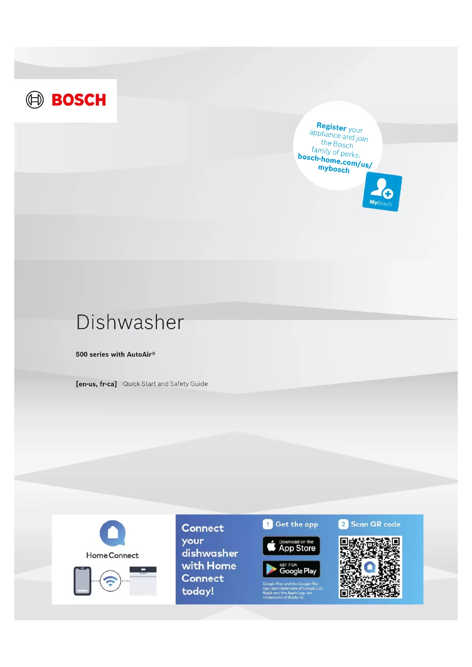 Register your appliance and join the Bosch family of perks: bosch-home.com/us/ mybosch Dishwasher 500 series with AutoAir® [en-us, fr-ca] Quick Start and Safety Guideen-us Read all instructions carefully before use. These precau- tions will reduce the risk of electrical shock, fire and injury to persons. When using kitchen appliances, basic safety precautions must be followed including those in the follow- ing pages. 1.1 Safety definitions Here you can find explanations of the safety signal words used in this manual. WARNING This indicates that death or serious injuries may occur as a result of non-observance of this warning. CAUTION This indicates that minor or moderate injuries may occur as a result of non-observance of this warning. NOTICE: This indicates that damage to the appliance or property may occur as a result of non-compliance with this advi- sory. Note:This alerts you to important information and/or tips. 1.2 General information To reduce the risk of fire, electrical shock, or serious in- jury, observe the following. ¡ Read and understand all instructions before using the appliance. ¡ Keep the provided documents in a safe place for future reference or for the next owner. ¡ Do not connect the appliance if it has been damaged in transit. ¡ Severe product damage and/or injury could result from the use of unqualified service technicians or non-origi- nal parts. All repairs must be performed by an autho- rized service provider using only original equipment fac- tory replacement parts. ¡ NSF/ANSI 184 Certified residential dishwashers are not intended for licensed food establishments. 1.3 Intended use Only use this appliance: ¡ for cleaning household dishware. ¡ In private households and in enclosed spaces in a resi- dential environment. ¡ Up to an altitude of 13,100 ft (4000 m) above sea level. 1.4 Restrictive Use This appliance is not intended for use by persons (includ- ing children) with reduced physical, sensory or mental ca- pabilities, or lack of experience and knowledge, unless they have been given supervision or instruction concern- ing use of the appliance by a person responsible for their safety. 1.5 Grounding instructions This appliance must be grounded to a metal, permanent wiring system or an equipment grounding conductor must be run with the circuit conductors and connected to the equipment grounding terminal or lead on the dishwasher. See the Installation Instructions included with this dish- washer for more information on electrical requirements. WARNING Improper connection of the equipment grounding conduc- tor can result in risk of electric shock. ▶ This appliance must be grounded. In the event of a malfunction or breakdown, grounding will reduce the risk of electric shock by providing a path of least resis- tance for electric current. This appliance is equipped with a cord having an equipment-grounding conductor. Check with a qualified electrician or authorized service representative if you are in doubt whether the appliance is properly grounded. 1.6 Safe use Follow these safety instructions when using the appliance. WARNING To reduce the risk of serious injury, observe the following. ▶ Read all instructions before using this dishwasher. ▶ Use this dishwasher only for its intended function, which is the washing of household dishware and kitchenware rated as dishwasher safe. ▶ Only use detergents or rinsing agents recommended for use in a dishwasher, and keep them out of the reach of children. ▶ Do not abuse, sit or stand on the door or dish racks of the dishwasher.
