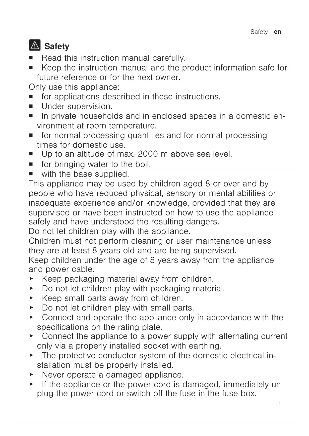 Safety ¡ Read this instruction manual carefully. ¡ Keep the instruction manual and the product information safe for future reference or for the next owner. Only use this appliance: ¡ for applications described in these instructions. ¡ Under supervision. ¡ In private households and in enclosed spaces in a domestic en- vironment at room temperature. ¡ for normal processing quantities and for normal processing times for domestic use. ¡ Up to an altitude of max. 2000m above sea level. ¡ for bringing water to the boil. ¡ with the base supplied. This appliance may be used by children aged 8 or over and by people who have reduced physical, sensory or mental abilities or inadequate experience and/or knowledge, provided that they are supervised or have been instructed on how to use the appliance safely and have understood the resulting dangers. Do not let children play with the appliance. Children must not perform cleaning or user maintenance unless they are at least 8 years old and are being supervised. Keep children under the age of 8 years away from the appliance and power cable. ▶ Keep packaging material away from children. ▶ Do not let children play with packaging material. ▶ Keep small parts away from children. ▶ Do not let children play with small parts. ▶ Connect and operate the appliance only in accordance with the specifications on the rating plate. ▶ Connect the appliance to a power supply with alternating current only via a properly installed socket with earthing. ▶ The protective conductor system of the domestic electrical in- stallation must be properly installed. ▶ Never operate a damaged appliance. ▶ If the appliance or the power cord is damaged, immediately un- plug the power cord or switch off the fuse in the fuse box.en Preventing material damage