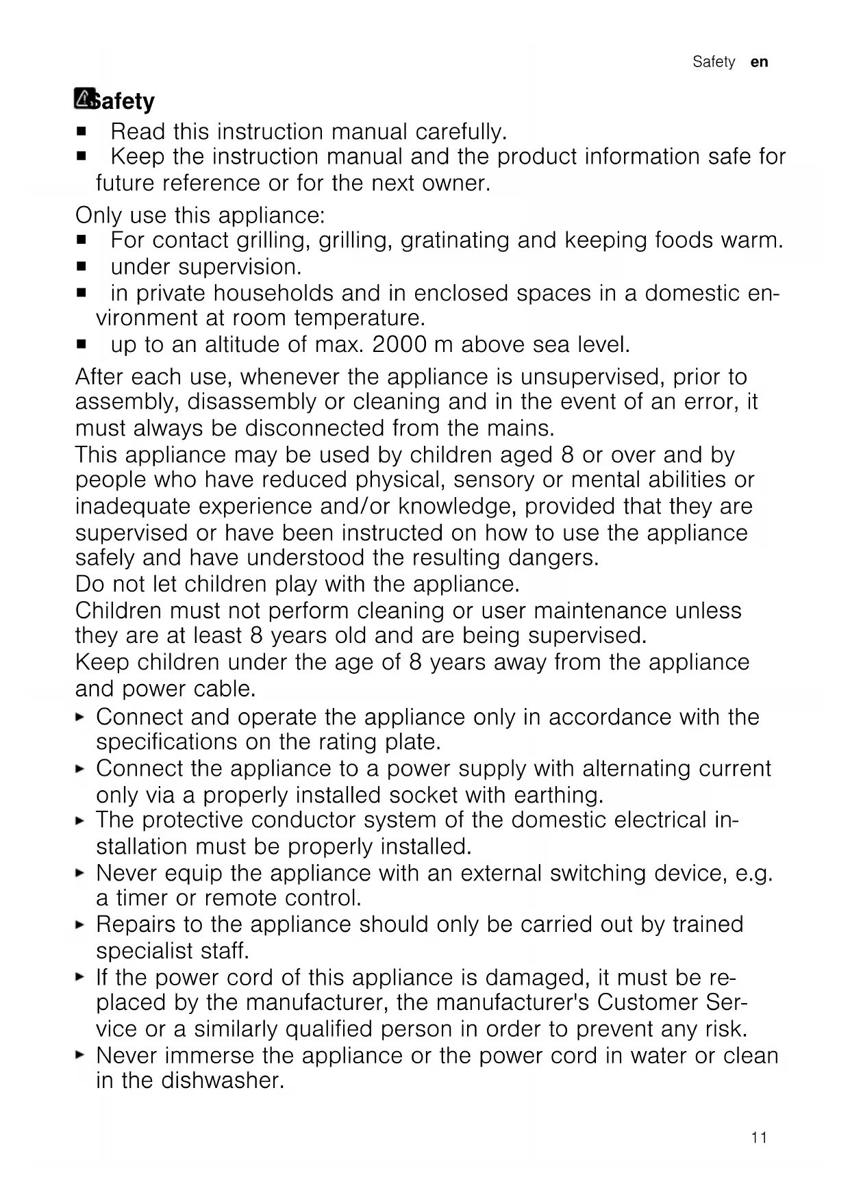 After the grill has cooled down com- pletely, clean the grill plates. Note: Slight smoke or odour emission dur- ing initial use is normal. OperationOperation General information Please bear this information in mind so that you can get the best out of your appliance. Before use, apply a small amount of cooking oil to the top sides of the grill plates. Use cooking oil with a high smoke point, such as refined sunflower oil. Do not put any food on the grill plates until the preset temperature has been reached and the indicator light has gone out. Take the food out of the refrigerator at least 30minutes before grilling and so allow them to reach room temperature. Completely thaw and dry frozen foods before grilling. Do not season meat and fish until after grilling. Acrylamide is harmful to your health and is produced when you cook cereal and potato products at very high temperat- ures. Do not grill the food to the point where it is too dark; remove any burnt residues. Contact grilling The food is grilled evenly from the bottom and top. The upper grill plate adjusts to the thickness of the food.