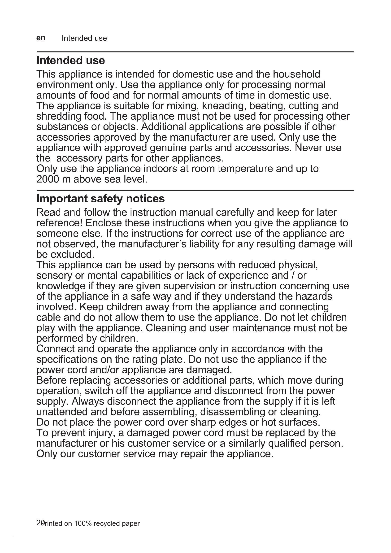 Intended use This appliance is intended for domestic use and the household environment only. Use the appliance only for processing normal amounts of food and for normal amounts of time in domestic use. The appliance is suitable for mixing, kneading, beating, cutting and shredding food. The appliance must not be used for processing other substances or objects. Additional applications are possible if other accessories approved by the manufacturer are used. Only use the appliance with approved genuine parts and accessories. Never use the accessory parts for other appliances. Only use the appliance indoors at room temperature and up to 2000 m above sea level. Important safety notices Read and follow the instruction manual carefully and keep for later reference! Enclose these instructions when you give the appliance to someone else. If the instructions for correct use of the appliance are not observed, the manufacturer’s liability for any resulting damage will be excluded. This appliance can be used by persons with reduced physical, sensory or mental capabilities or lack of experience and / or knowledge if they are given supervision or instruction concerning use of the appliance in a safe way and if they understand the hazards involved. Keep children away from the appliance and connecting cable and do not allow them to use the appliance. Do not let children play with the appliance. Cleaning and user maintenance must not be performed by children. Connect and operate the appliance only in accordance with the specifications on the rating plate. Do not use the appliance if the power cord and/or appliance are damaged. Before replacing accessories or additional parts, which move during operation, switch off the appliance and disconnect from the power supply. Always disconnect the appliance from the supply if it is left unattended and before assembling, disassembling or cleaning. Do not place the power cord over sharp edges or hot surfaces. To prevent injury, a damaged power cord must be replaced by the manufacturer or his customer service or a similarly qualified person. Only our customer service may repair the appliance. Printed on 100% recycled paper Intended use21