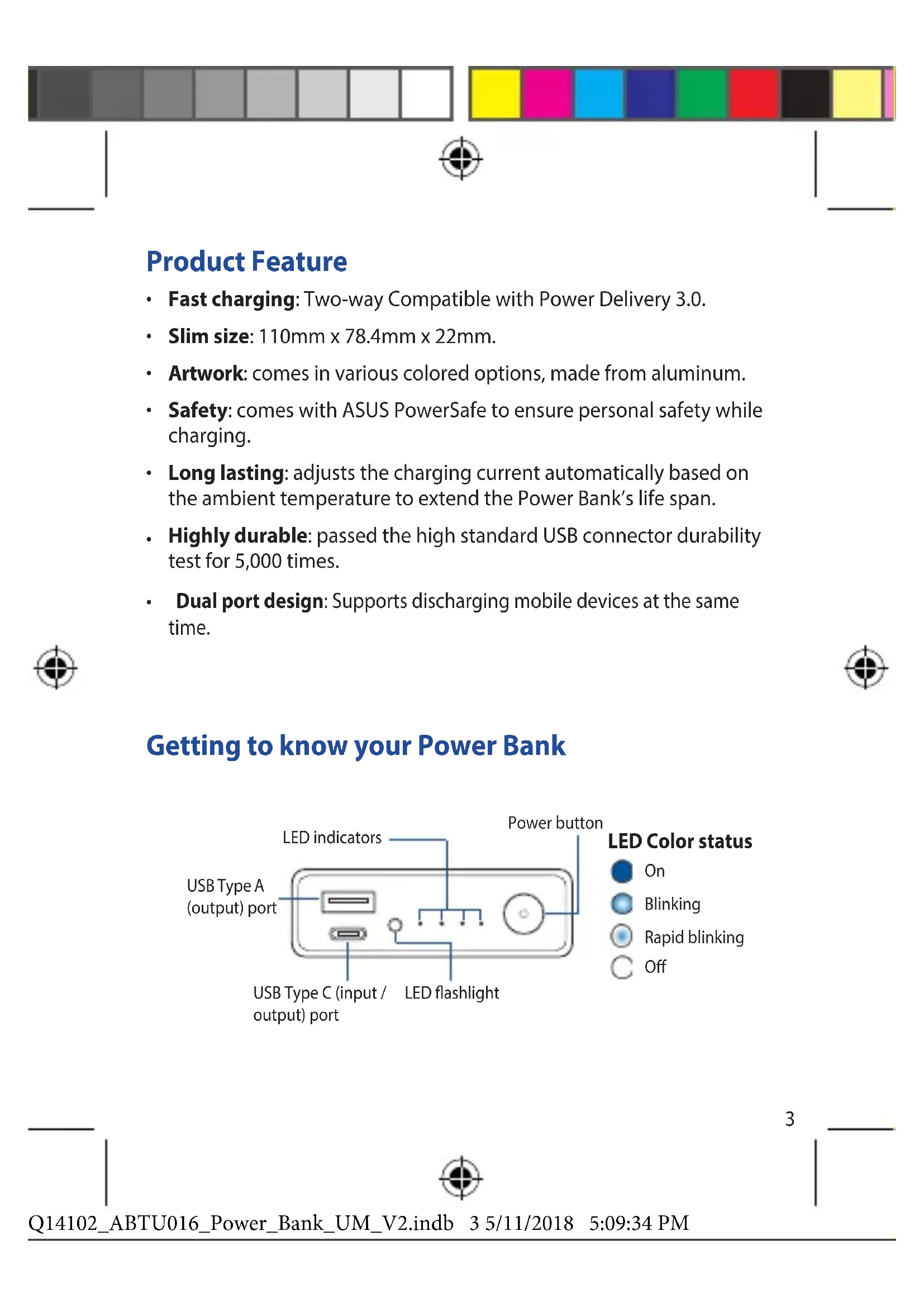 - Dual port design: Supports discharging mobile devices at the same time. Getting to know your Power Bank USB Type C (input / output) port USB Type A (output) port LED indicators Power button LED Color status