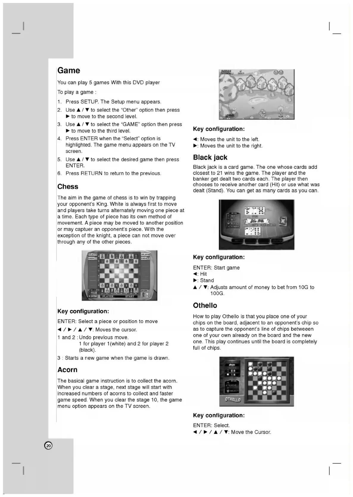 Startsanew game whenthe game isdrawn. Acorn Thebasical game instructionistocollecttheacorn.When you cleara stage, next stage willstartwithincreasednumbersofacornstocollectandfaster game speed. When you clearthe stage 10, the game menu option appears ontheTVscreen. Key configuration: b:Movestheunittotheleft.B:Movestheunittothe right. Black jack Black jack isacard game. Theonewhosecardsaddclosestto21winsthe game. The player andthebanker get dealttwocardseach.The player thenchoosestoreceiveanothercard (Hit) orusewhatwasdealt (Stand). Youcan get many cardsas you can. Key configuration: ENTER:Start game b:HitB:Standv/V: Adjusts amountof money tobetfrom10Gto100G. Othello Howto play Othelloisthat you place oneof your chips onthe board, adjacent toan opponent's chip soasto capture the opponent's lineof chips betweeenoneof your own already ontheboardandthenewone.This play continuesuntiltheboardis completely fullof chips. Key configuration: ENTER:Select.b/B/v/V:MovetheCursor.21 Operation Battle Hoola TheBattleHoolaisacard game. Players startthe game with7 pieces ofcardsandtheonewhosesumofcard'snumbersislowestornonewinsthe game. Commands GetGetsanewcard. Register Register card(s) you haveselected.Attach Attach card(s) you haveselectedto already registered card(s) ontheboard.DiscardYoushoulddiscardoneof your cardto change theturn. Stop Stops the game. General rules Winning Condition: When you havenocard. Sumof your card'snumbersis lowest, Ifoneoffour players stops the game. Registering Condition: Number7can register alone. Morethan3 pieces ofcardswithsamenumber. Morethan3 pieces straight numberscardswithsamesuit. Attaching Condition: