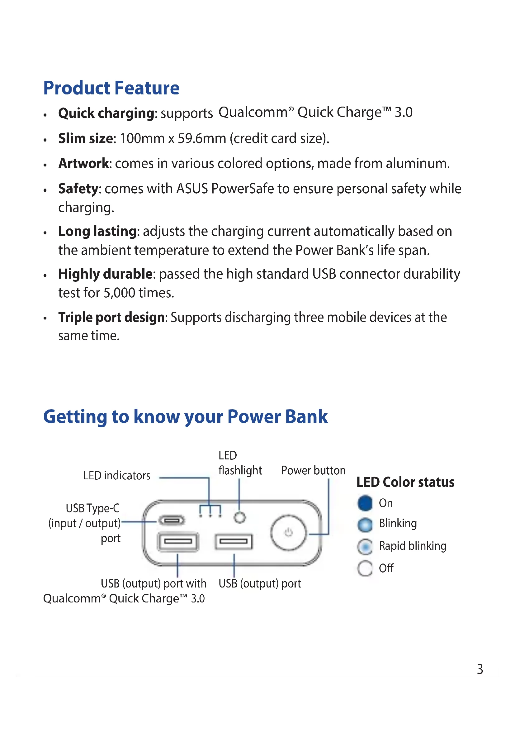 - Triple port design: Supports discharging three mobile devices at the same time. Getting to know your Power Bank USB Type-C (input / output) port USB (output) port with Qualcomm® Quick Charge™