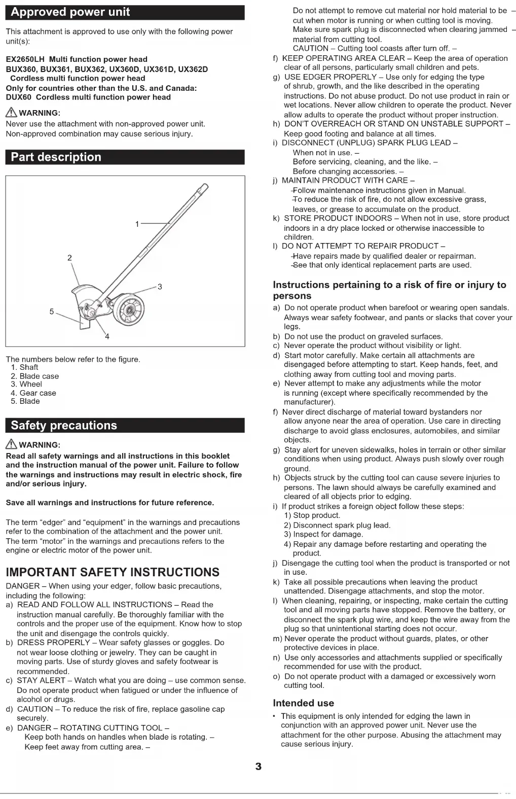 Read all safety warnings and all instructions in this booklet and the instruction manual of the power unit. Failure to follow the warnings and instructions may result in electric shock, re and/or serious injury. Save all warnings and instructions for future reference. The term “edger” and “equipment” in the warnings and precautions refer to the combination of the attachment and the power unit. The term “motor” in the warnings and precautions refers to the engine or electric motor of the power unit.