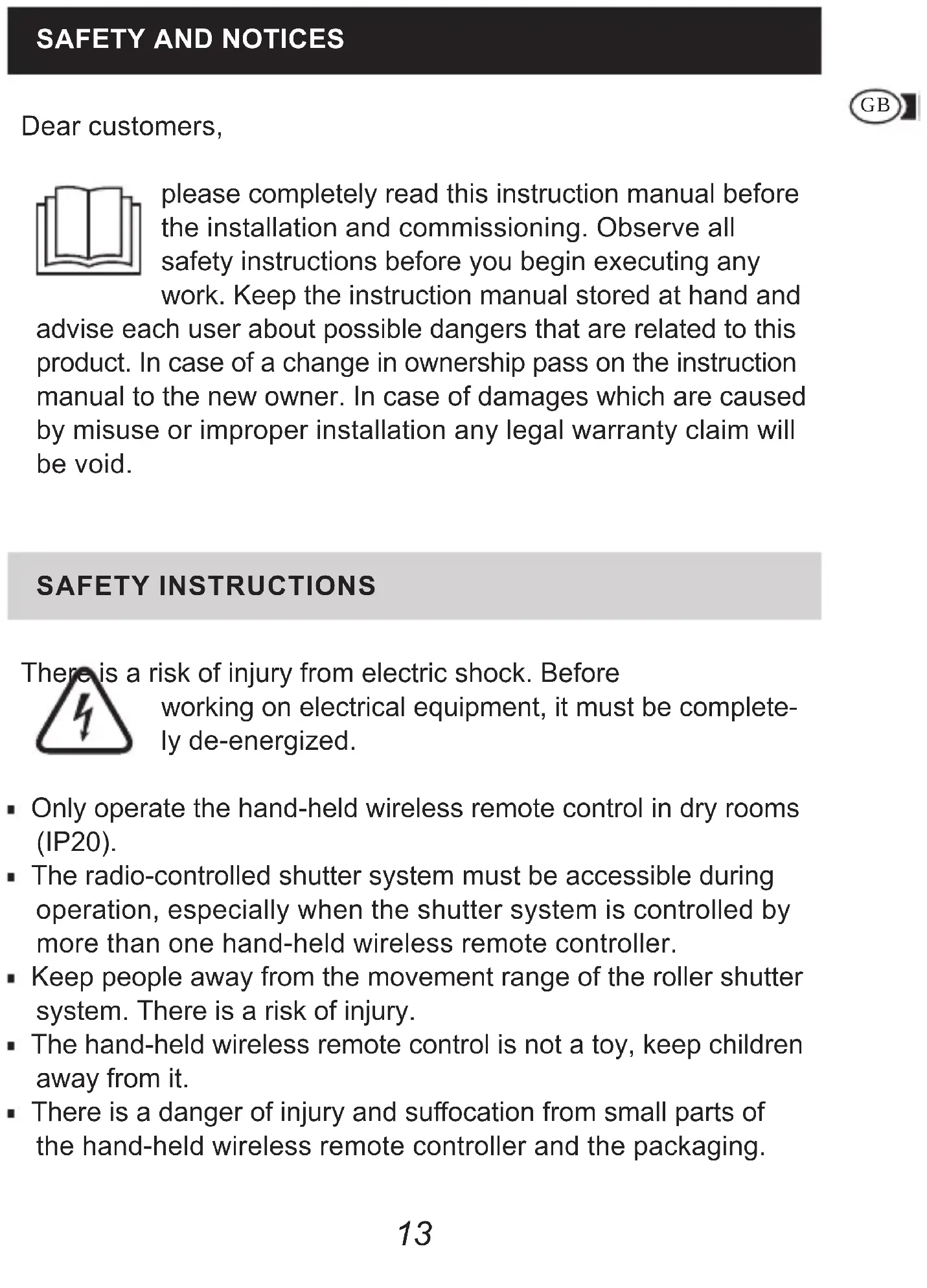Dear customers, please completely read this instruction manual before the installation and commissioning Observe all safety instructions before you begin executing any work Keep the instruction manual stored at hand and advise each user about possible dangers that are related to this product In case of a change in ownership pass on the instruction manual to the new owner In case of damages which are caused by misuse or improper installation any legal warranty claim will be void SAFETY INSTRUCTIONS There is a risk of injury from electric shock Before working on electrical equipment, it must be complete- ly de-energized Only operate the hand-held wireless remote control in dry rooms (IP20) The radio-controlled shutter system must be accessible during operation, especially when the shutter system is controlled by more than one hand-held wireless remote controller Keep people away from the movement range of the roller shutter system There is a risk of injury The hand-held wireless remote control is not a toy, keep children away from it There is a danger of injury and suocation from small parts of the hand-held wireless remote controller and the packaging14 When operating a shutter system via a hand-held wireless remo- te controller the country-specic regulations must be observed. Only replace the batteries with the same type, LR03 / AAA Do not move the tubular motor beyond the end positions Risk of damage!