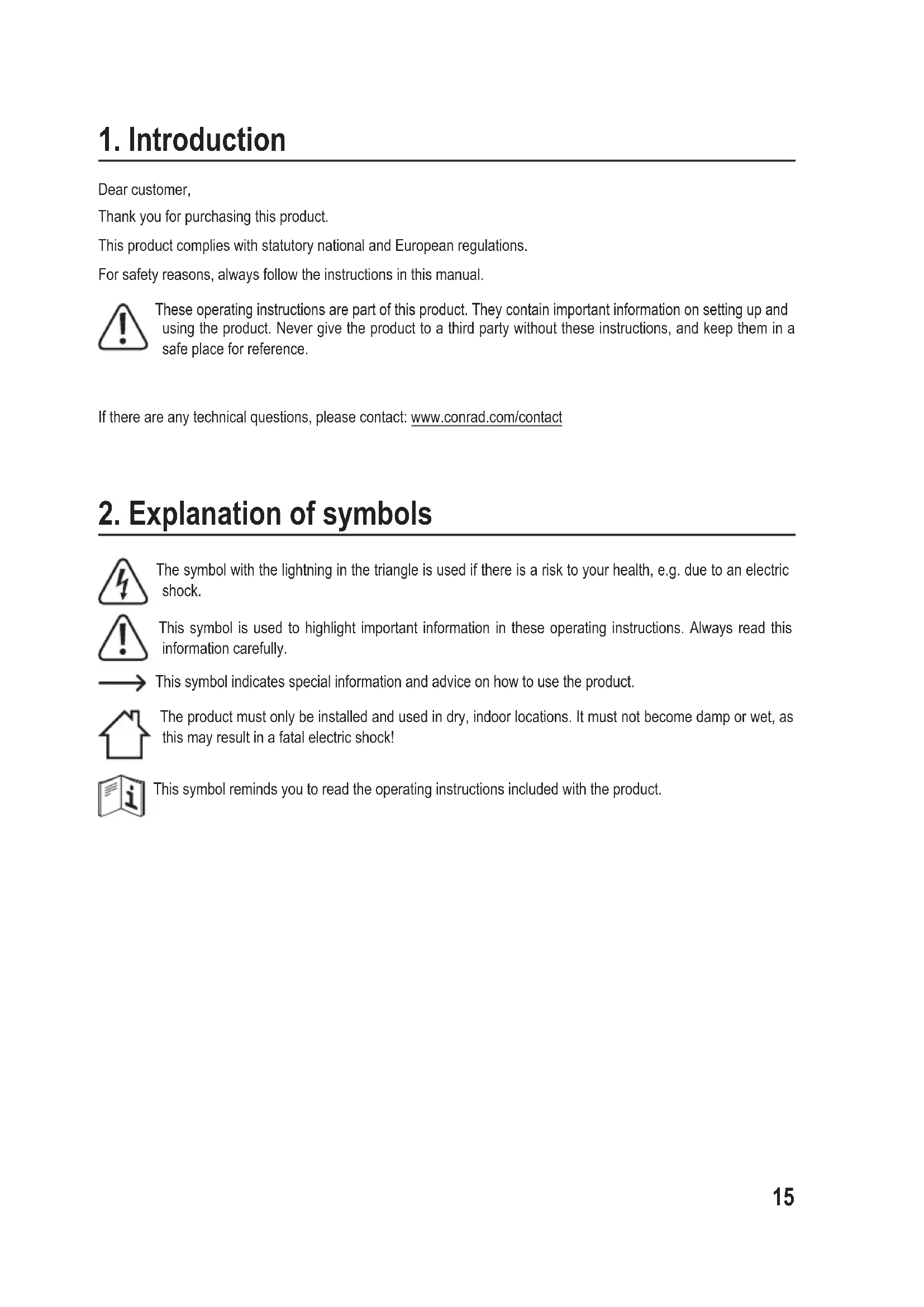 The symbol with the lightning in the triangle is used if there is a risk to your health, e.g. due to an electric shock. This symbol is used to highlight important information in these operating instructions. Always read this information carefully. This symbol indicates special information and advice on how to use the product. The product must only be installed and used in dry, indoor locations. It must not become damp or wet, as this may result in a fatal electric shock! This symbol reminds you to read the operating instructions included with the product.16
