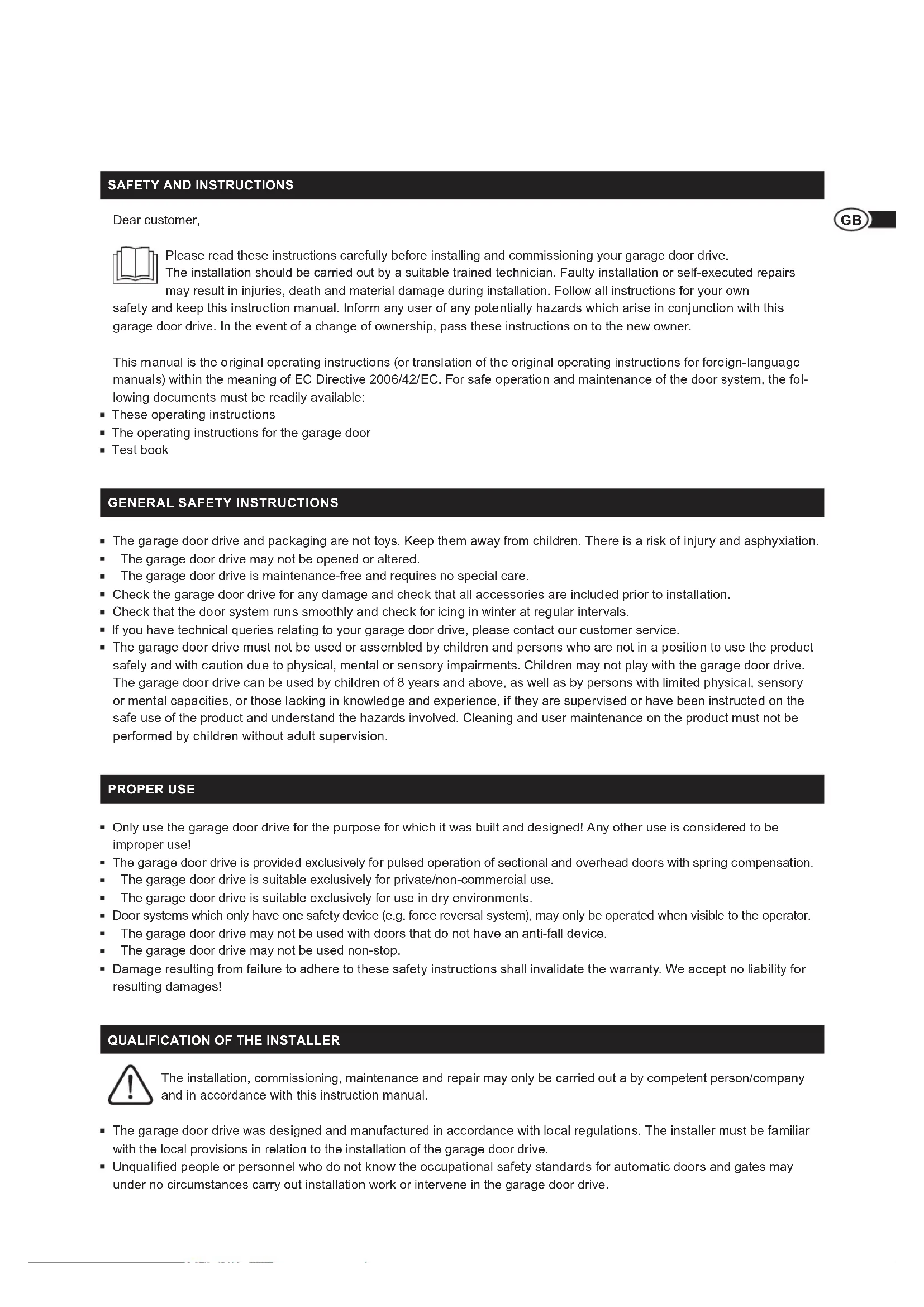 Dear customer, Please read these instructions carefully before installing and commissioning your garage door drive The installation should be carried out by a suitable trained technician Faulty installation or self-executed repairs may result in injuries, death and material damage during installation Follow all instructions for your own safety and keep this instruction manual Inform any user of any potentially hazards which arise in conjunction with this garage door drive In the event of a change of ownership, pass these instructions on to the new owner This manual is the original operating instructions (or translation of the original operating instructions for foreign-language manuals) within the meaning of EC Directive 2006/42/EC. For safe operation and maintenance of the door system, the fol- lowing documents must be readily available: These operating instructions The operating instructions for the garage door Test book