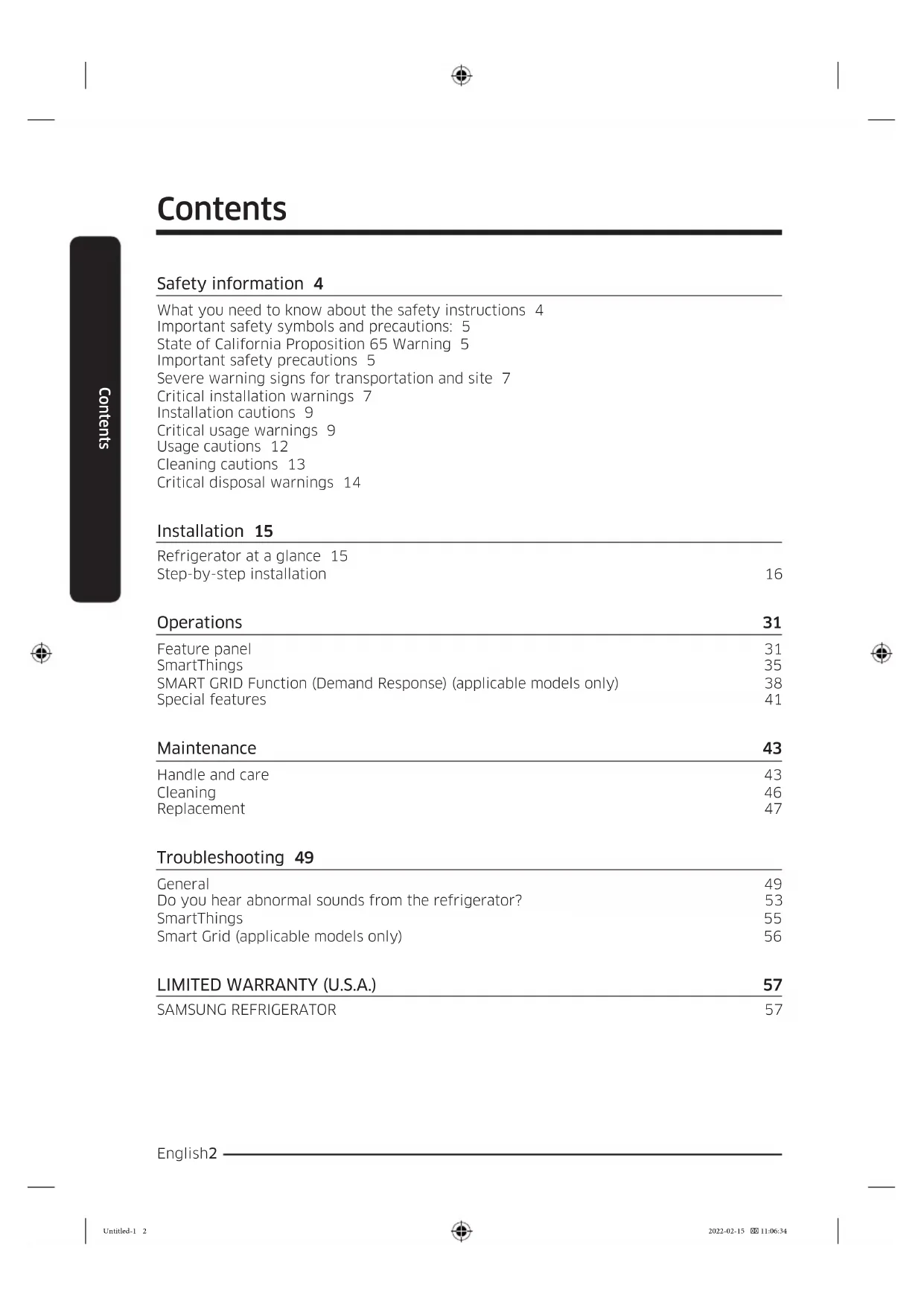 Refrigerator User manual RS28A500A**/RS23A500A** Free Standing Appliance Untitled-1 1 2022-02-15 11:06:34English2 Contents Contents Safety information 4 What you need to know about the safety instructions 4 Important safety symbols and precautions: 5 State of California Proposition 65 Warning 5 Important safety precautions 5 Severe warning signs for transportation and site 7 Critical installation warnings 7 Installation cautions 9 Critical usage warnings 9 Usage cautions 12 Cleaning cautions 13 Critical disposal warnings 14 Installation 15 Refrigerator at a glance 15 Step-by-step installation 16 Operations 31 Feature panel 31 SmartThings 35 SMART GRID Function (Demand Response) (applicable models only) 38 Special features 41 Maintenance 43 Handle and care 43 Cleaning 46 Replacement 47 Troubleshooting 49 General 49 Do you hear abnormal sounds from the refrigerator? 53 SmartThings 55 Smart Grid (applicable models only) 56
