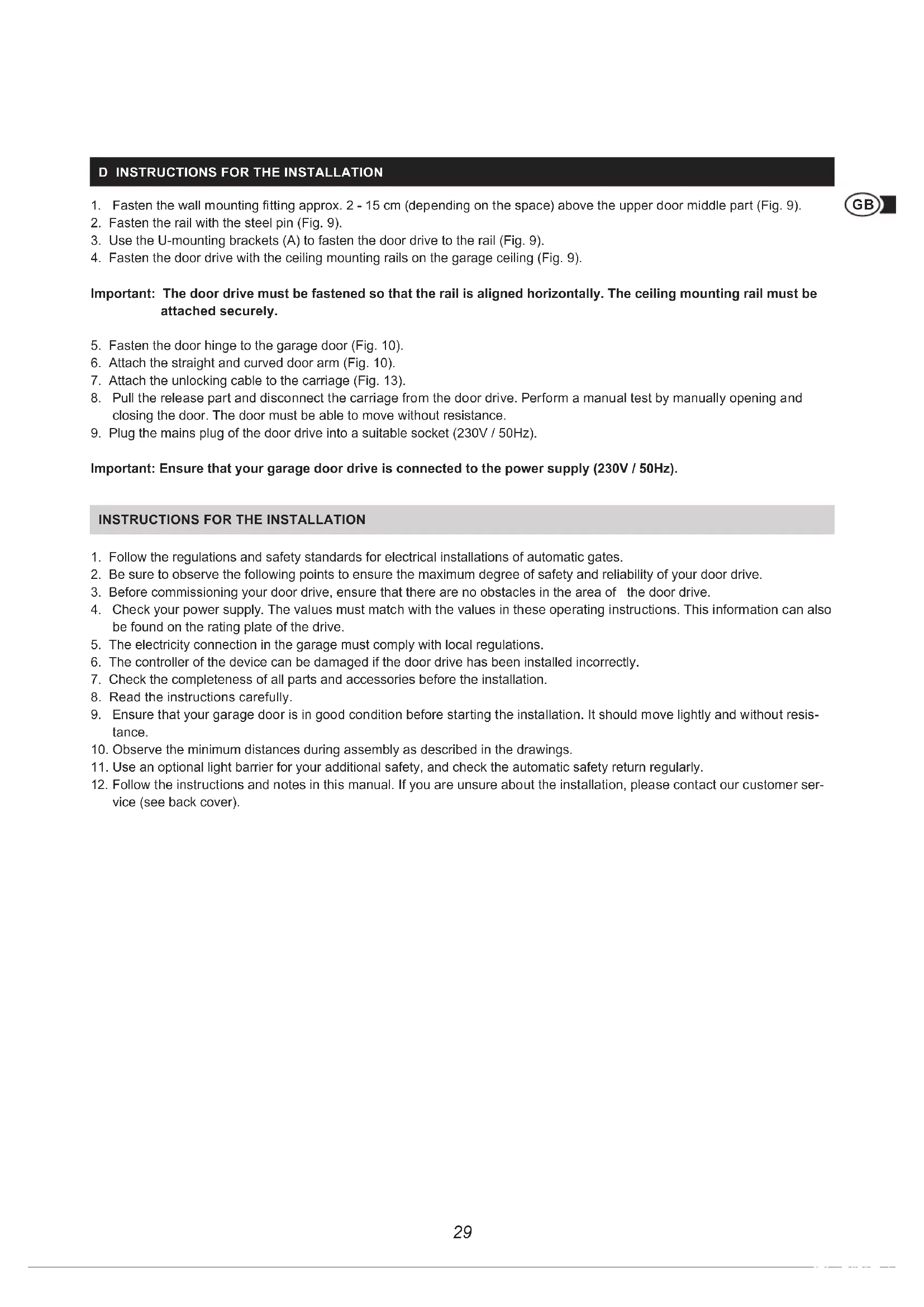 Fig.1 Fig. 2 Fig.1 Fig. 3 A INSTALLATION Read the instructions carefully. The garage door must be suitable for the use with the door drive. The door must be able to move lightly and freely. The door must be balanced and easy to move with the hand.