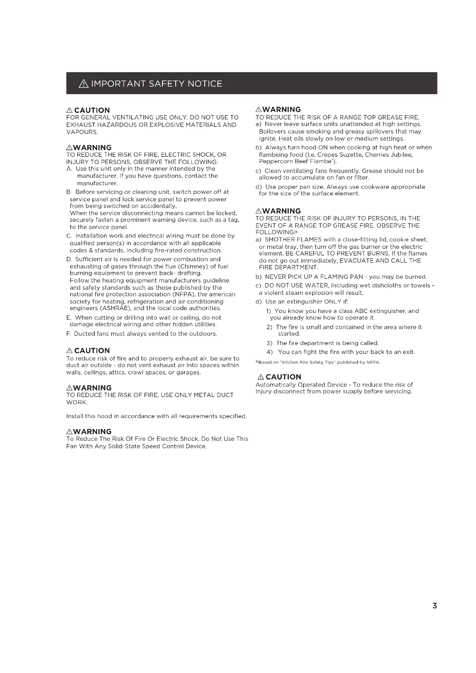 I CAUTION FOR GENERAL VENTILATING USE ONLY. DO NOT USE TO EXHAUST HAZARDOUS OR EXPLOSIVE MATERIALS AND VAPOURS. I WARNING TO REDUCE THE RISK OF FIRE, ELECTRIC SHOCK, ORINJURY TO PERSONS, OBSERVE THE FOLLOWING:A. Use this unit only in the manner intended by the manufacturer. If you have questions, contact the manufacturer.B. Before servicing or cleaning unit, switch power o at service panel and lock service panel to prevent power from being switched on accidentally. When the service disconnecting means cannot be locked, securely fasten a prominent warning device, such as a tag, to the service panel.C. Installation work and electrical wiring must be done by qualified person(s) in accordance with all applicable codes & standards, including fire-rated construction.D. Sucient air is needed for power combustion and exhausting of gases through the flue (Chimney) of fuel burning equipment to prevent back- drafting. Follow the heating equipment manufacturers guideline and safety standards such as those published by the national fire protection association (NFPA), the american society for heating, refrigeration and air conditioning engineers (ASHRAE), and the local code authorities.E. When cutting or drilling into wall or ceiling, do not damage electrical wiring and other hidden utilities.F. Ducted fans must always vented to the outdoors. I CAUTION To reduce risk of fire and to properly exhaust air, be sure to duct air outside - do not vent exhaust air into spaces within walls, ceilings, attics, crawl spaces, or garages. I WARNING TO REDUCE THE RISK OF FIRE, USE ONLY METAL DUCT WORK.Install this hood in accordance with all requirements specified. I WARNING To Reduce The Risk Of Fire Or Electric Shock, Do Not Use This Fan With Any Solid-State Speed Control Device. I WARNING TO REDUCE THE RISK OF A RANGE TOP GREASE FIRE.a) Never leave surface units unattended at high settings. Boilovers cause smoking and greasy spillovers that may ignite. Heat oils slowly on low or medium settings.b) Always turn hood ON when cooking at high heat or when flambeing food (I.e. Crepes Suzette, Cherries Jubilee, Peppercorn Beef Flambe’).c) Clean ventilating fans frequently. Grease should not be allowed to accumulate on fan or filter.d) Use proper pan size. Always use cookware appropriate for the size of the surface element. I WARNING TO REDUCE THE RISK OF INJURY TO PERSONS, IN THE EVENT OF A RANGE TOP GREASE FIRE, OBSERVE THE FOLLOWING: a) SMOTHER FLAMES with a close-fitting lid, cookie sheet, or metal tray, then turn o the gas burner or the electric element. BE CAREFUL TO PREVENT BURNS. If the flames do not go out immediately, EVACUATE AND CALL THE FIRE DEPARTMENT.b) NEVER PICK UP A FLAMING PAN - you may be burned.c) DO NOT USE WATER, including wet dishcloths or towels - a violent steam explosion will result.d) Use an extinguisher ONLY if:1) You know you have a class ABC extinguisher, and you already know how to operate it.2) The fire is small and contained in the area where it started.3) The fire department is being called.4) You can fight the fire with your back to an exit. Based on “Kitchen Fire Safety Tips” published by NFPA. I CAUTION Automatically Operated Device - To reduce the risk ofInjury disconnect from power supply before servicing.4