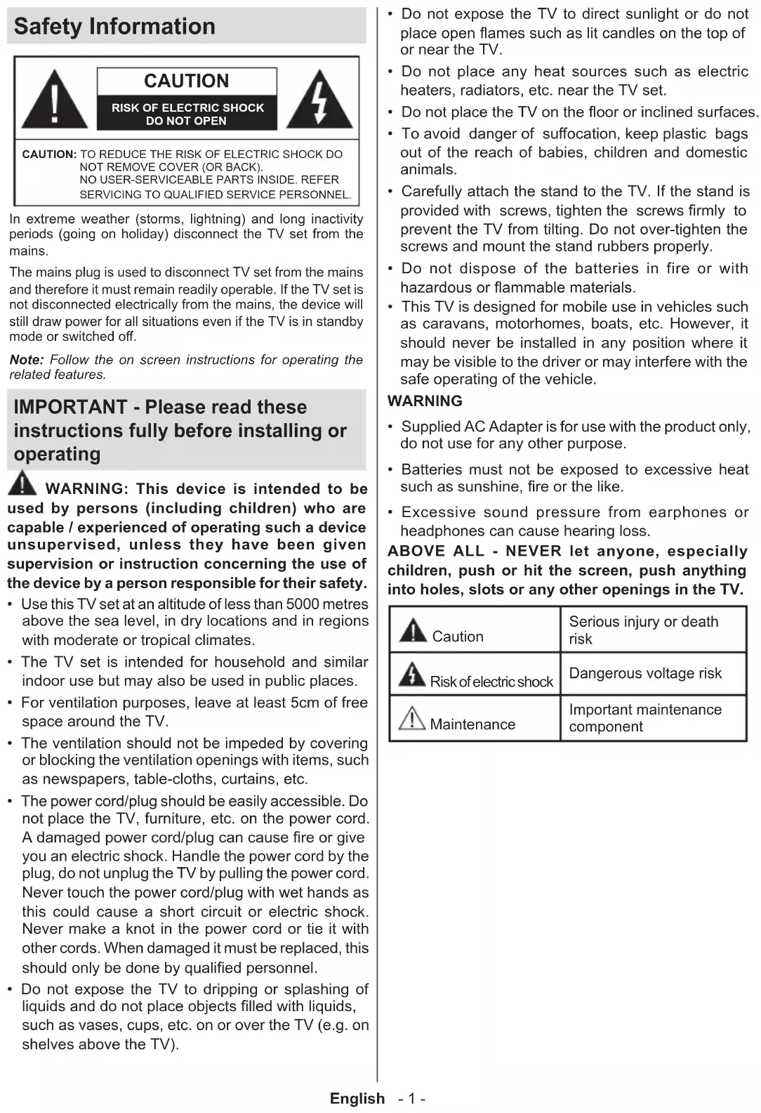 English - 1 - Safety Information CAUTION RISK OF ELECTRIC SHOCKDO NOT OPENCAUTION: TO REDUCE THE RISK OF ELECTRIC SHOCK DO NOT REMOVE COVER (OR BACK). NO USER-SERVICEABLE PARTS INSIDE. REFER SERVICING TO QUALIFIED SERVICE PERSONNEL.Note: Follow the on screen instructions for operating the related features.In extreme weather (storms, lightning) and long inactivity periods (going on holiday) disconnect the TV set from the mains.The mains plug is used to disconnect TV set from the mains and therefore it must remain readily operable. If the TV set is not disconnected electrically from the mains, the device will still draw power for all situations even if the TV is in standby mode or switched o. IMPORTANT - Please read these instructions fully before installing or operating