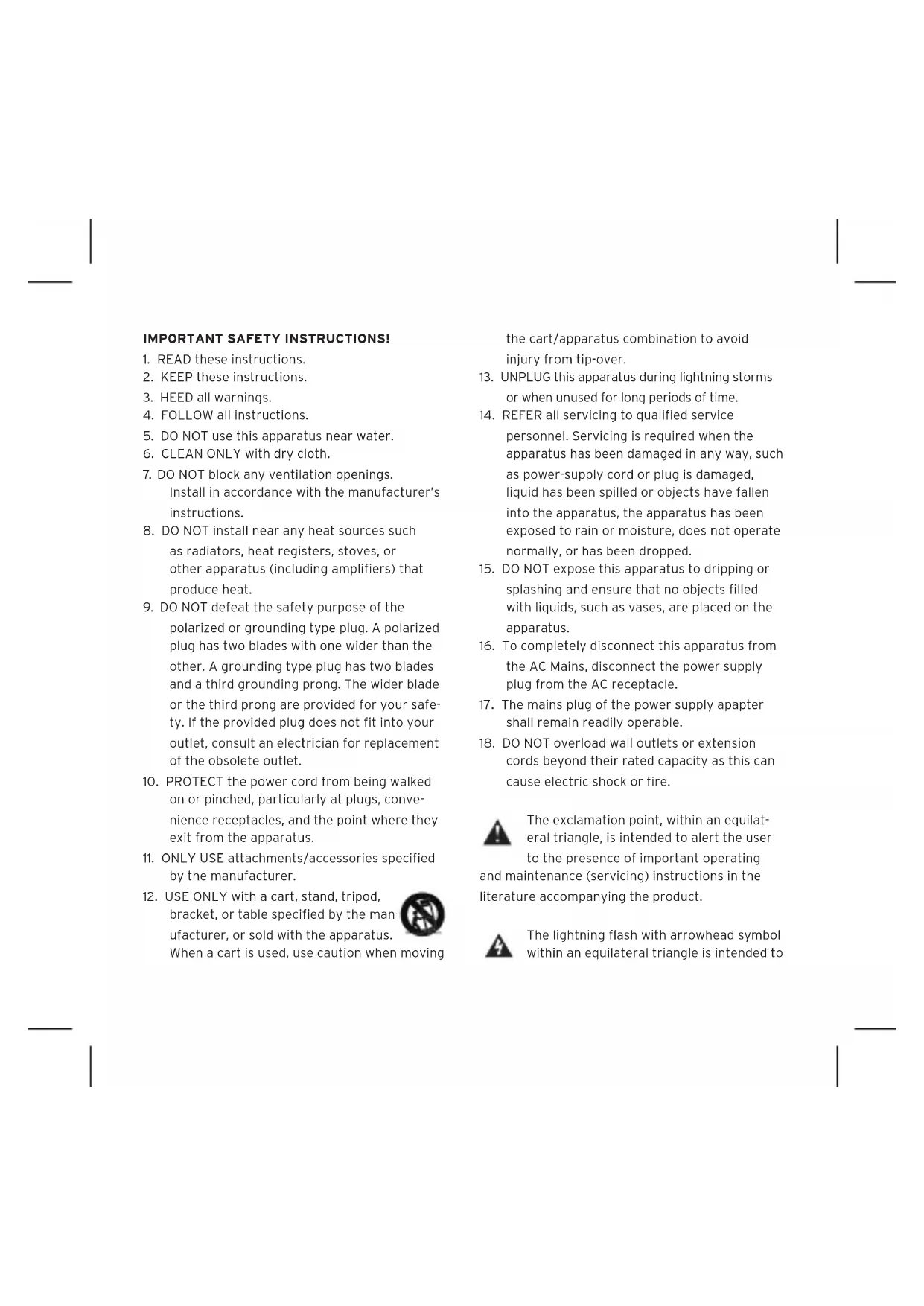 Voltages in this equipment are hazardous to life. No user-serviceable parts inside. Refer all servicing to qualified service personnel. Place the equipment near a main power supply outlet and make sure that you can easily access the power breaker switch. In Singapore, please only use the provided 3-pin detachable plug adapter to charge or power the product.WARNING: This product is intended to be operat- ed ONLY from the AC Voltages listed on the back panel or included power supply of the product. Operation from other voltages other than those indicated may cause irreversible damage to the product and void the products warranty. The use of AC Plug Adapters is cautioned because it can allow the product to be plugged into voltages in which the product was not designed to operate. If the product is equipped with a detachable power cord, use only the type provided with your product or by your local distributor and/or retailer. If you are unsure of the correct operational voltage, please contact your local distributor and/ or retailer.