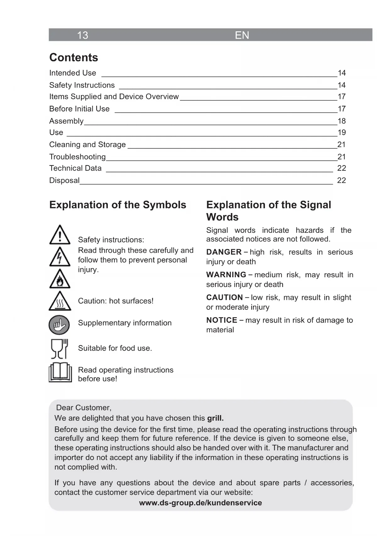 Anruf in das deutsche Festnetz zum Tarif Ihres Anbieters. www.ds-group.de/kundenservice Alle Rechte vorbehalten.13 EN Contents Intended Use ______________________________________________________14 Safety Instructions __________________________________________________14 Items Supplied and Device Overview ____________________________________17 Before Initial Use ___________________________________________________17 Assembly __________________________________________________________18 Use ______________________________________________________________19 Cleaning and Storage ________________________________________________21 Troubleshooting _____________________________________________________21 Technical Data ____________________________________________________ 22 Disposal__________________________________________________________ 22 Dear Customer, We are delighted that you have chosen this grill. Before using the device for the rst time, please read the operating instructions through carefully and keep them for future reference. If the device is given to someone else, these operating instructions should also be handed over with it. The manufacturer and importer do not accept any liability if the information in these operating instructions is not complied with. If you have any questions about the device and about spare parts / accessories, contact the customer service department via our website: www.ds-group.de/kundenservice Explanation of the Symbols Safety instructions: Read through these carefully and follow them to prevent personal injury. Caution: hot surfaces! Supplementary information Suitable for food use. Read operating instructions before use! Explanation of the Signal Words Signal words indicate hazards if the associated notices are not followed. DANGER – high risk, results in serious injury or death WARNING – medium risk, may result in serious injury or death CAUTION – low risk, may result in slight or moderate injury NOTICE – may result in risk of damage to materialEN 14 Intended Use