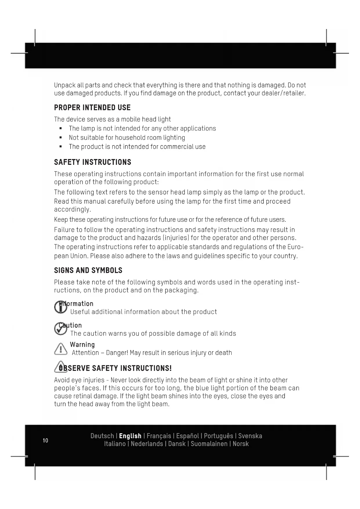 The device serves as a mobile head light § The lamp is not intended for any other applications § Not suitable for household room lighting § The product is not intended for commercial use SAFETY INSTRUCTIONS These operating instructions contain important information for the first use normal operation of the following product: The following text refers to the sensor head lamp simply as the lamp or the product. Read this manual carefully before using the lamp for the first time and proceed accordingly. Keep these operating instructions for future use or for the reference of future users. Failure to follow the operating instructions and safety instructions may result in damage to the product and hazards (injuries) for the operator and other persons. The operating instructions refer to applicable standards and regulations of the Euro- pean Union. Please also adhere to the laws and guidelines specific to your country.