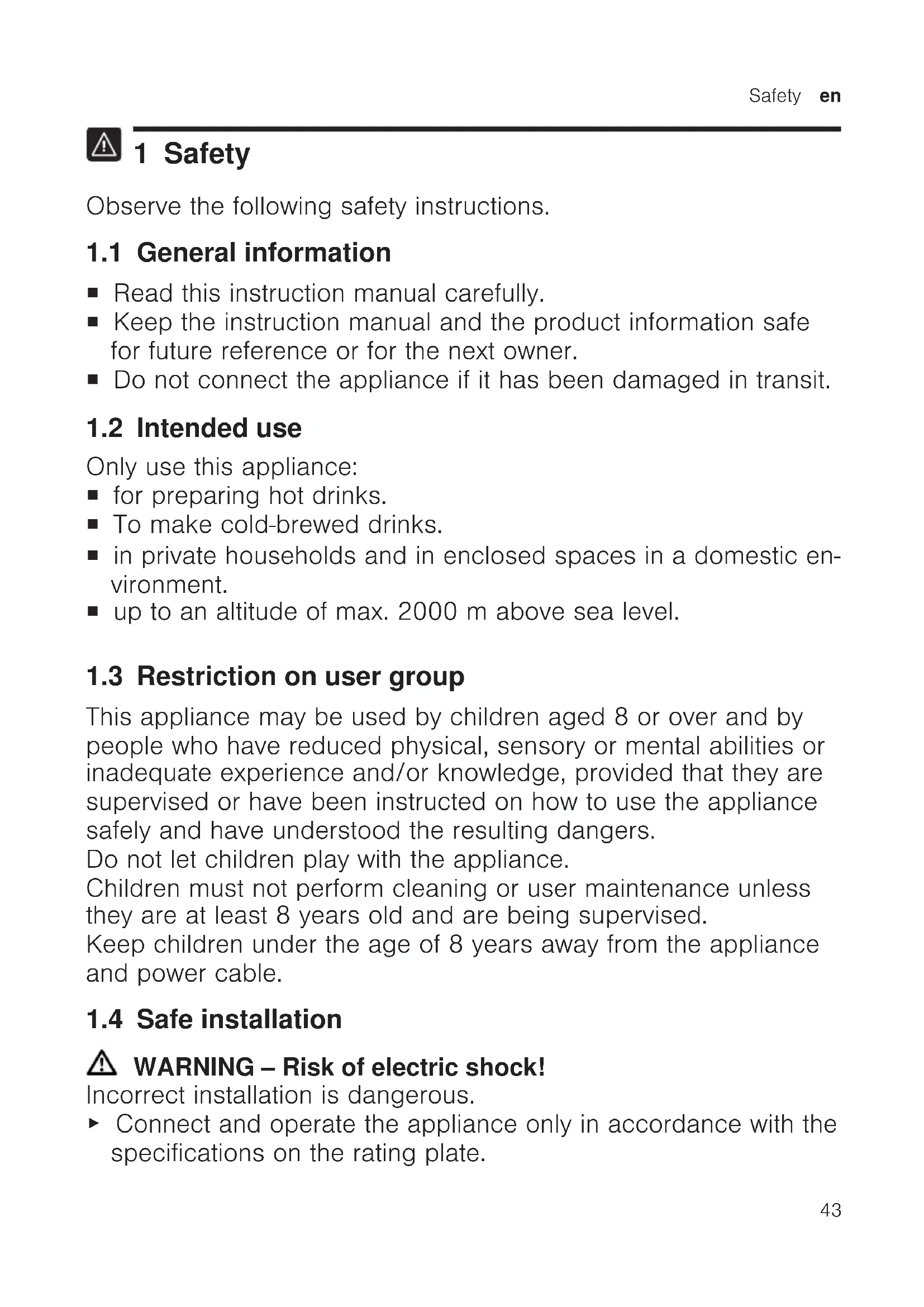 1 Safety Observe the following safety instructions. 1.1 General information ¡ Read this instruction manual carefully. ¡ Keep the instruction manual and the product information safe for future reference or for the next owner. ¡ Do not connect the appliance if it has been damaged in transit. 1.2 Intended use Only use this appliance: ¡ for preparing hot drinks. ¡ To make cold-brewed drinks. ¡ in private households and in enclosed spaces in a domestic en- vironment. ¡ up to an altitude of max. 2000m above sea level. 1.3 Restriction on user group This appliance may be used by children aged 8 or over and by people who have reduced physical, sensory or mental abilities or inadequate experience and/or knowledge, provided that they are supervised or have been instructed on how to use the appliance safely and have understood the resulting dangers. Do not let children play with the appliance. Children must not perform cleaning or user maintenance unless they are at least 8 years old and are being supervised. Keep children under the age of 8 years away from the appliance and power cable. 1.4 Safe installation WARNING‒Risk of electric shock! Incorrect installation is dangerous. ▶ Connect and operate the appliance only in accordance with the specifications on the rating plate.en Safety