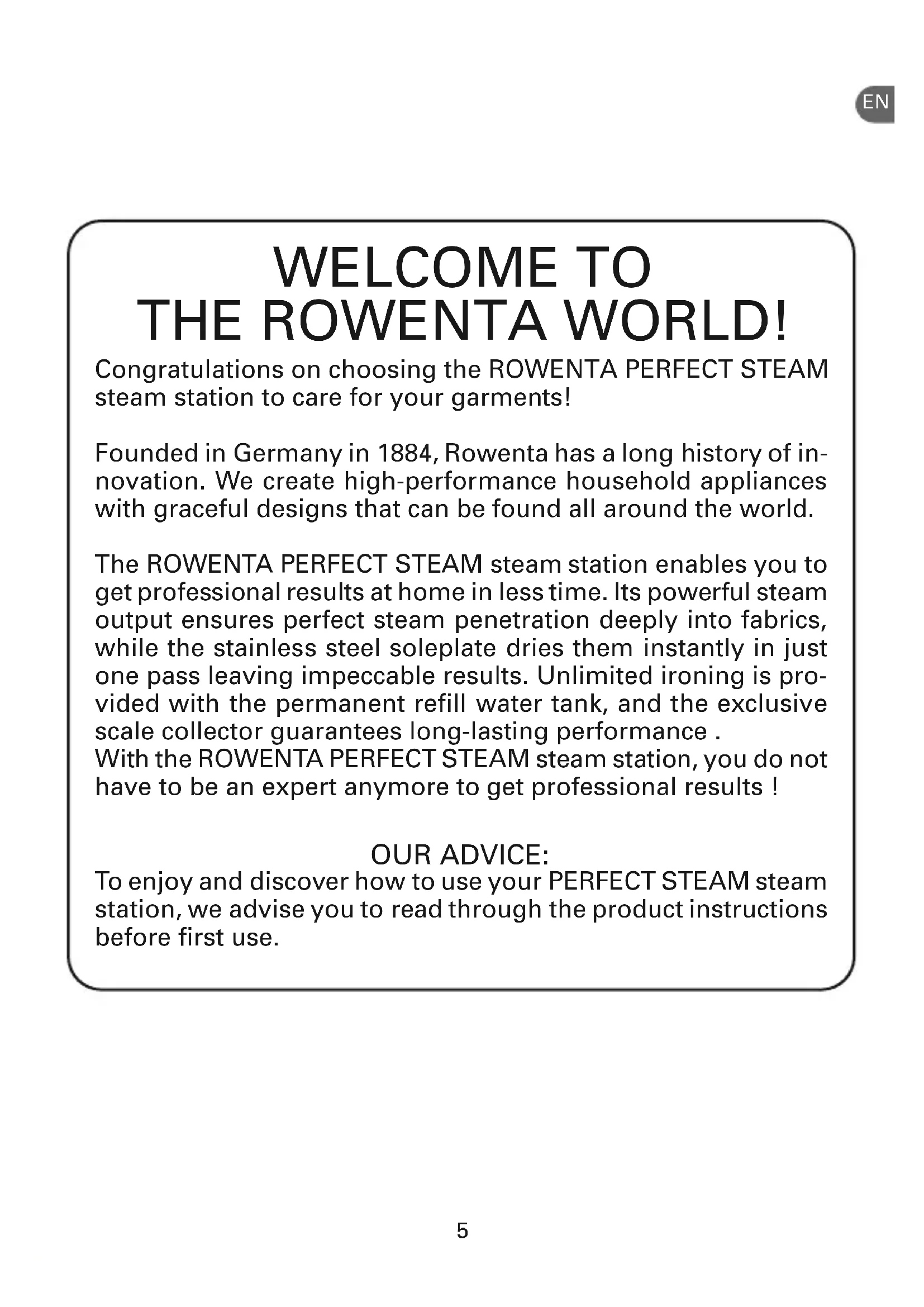 WELCOME TO THE ROWENTA WORLD! Congratulations on choosing the ROWENTA PERFECT STEAM steam station to care for your garments! Founded in Germany in 1884, Rowenta has a long history of in- novation. We create high-performance household appliances with graceful designs that can be found all around the world. The ROWENTA PERFECT STEAM steam station enables you to get professional results at home in less time. Its powerful steam output ensures perfect steam penetration deeply into fabrics, while the stainless steel soleplate dries them instantly in just one pass leaving impeccable results. Unlimited ironing is pro- vided with the permanent refill water tank, and the exclusive scale collector guarantees long-lasting performance . With the ROWENTA PERFECT STEAM steam station, you do not have to be an expert anymore to get professional results ! OUR ADVICE: To enjoy and discover how to use your PERFECT STEAM steam station, we advise you to read through the product instructions before first use.