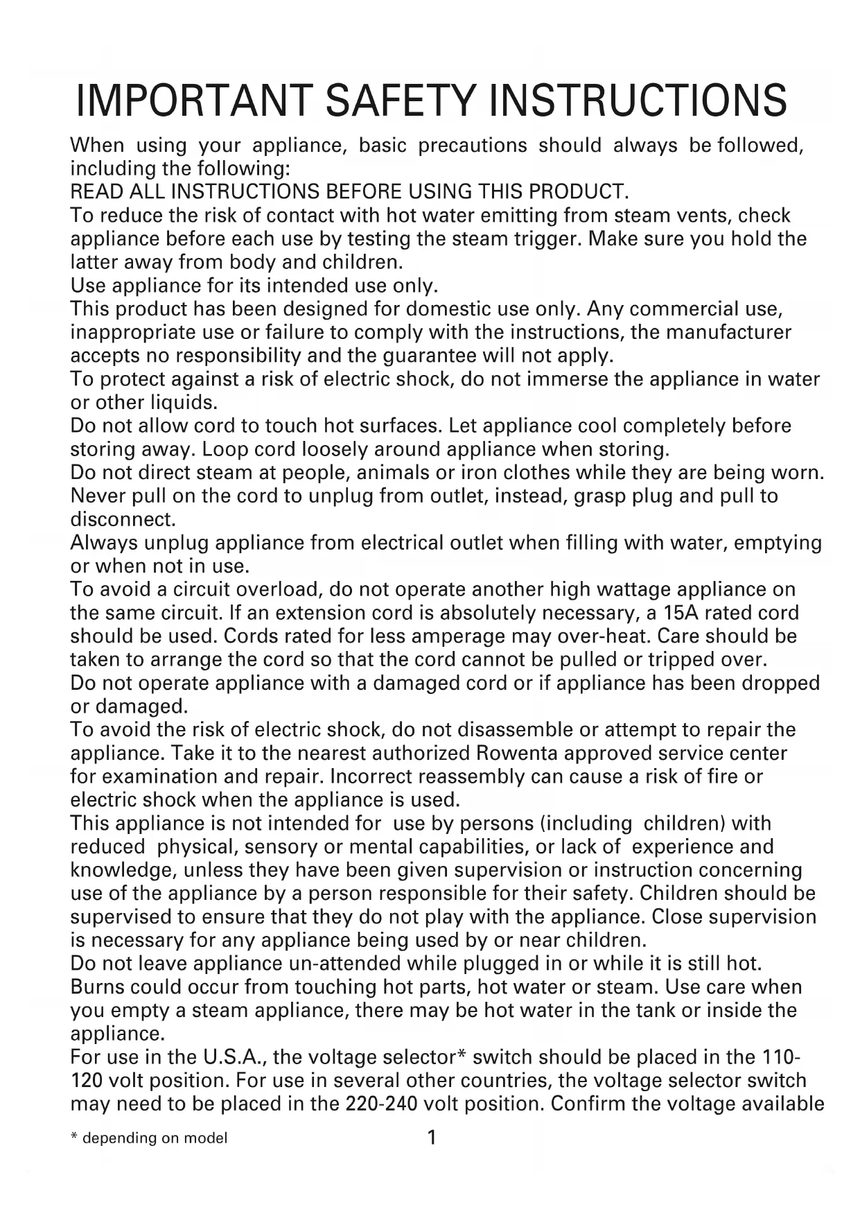 When using your appliance, basic precautions should always be followed, including the following: READ ALL INSTRUCTIONS BEFORE USING THIS PRODUCT. To reduce the risk of contact with hot water emitting from steam vents, check appliance before each use by testing the steam trigger. Make sure you hold the latter away from body and children. Use appliance for its intended use only. This product has been designed for domestic use only. Any commercial use, inappropriate use or failure to comply with the instructions, the manufacturer accepts no responsibility and the guarantee will not apply. To protect against a risk of electric shock, do not immerse the appliance in water or other liquids. Do not allow cord to touch hot surfaces. Let appliance cool completely before storing away. Loop cord loosely around appliance when storing. Do not direct steam at people, animals or iron clothes while they are being worn. Never pull on the cord to unplug from outlet, instead, grasp plug and pull to disconnect. Always unplug appliance from electrical outlet when filling with water, emptying or when not in use. To avoid a circuit overload, do not operate another high wattage appliance on the same circuit. If an extension cord is absolutely necessary, a 15A rated cord should be used. Cords rated for less amperage may over-heat. Care should be taken to arrange the cord so that the cord cannot be pulled or tripped over. Do not operate appliance with a damaged cord or if appliance has been dropped or damaged. To avoid the risk of electric shock, do not disassemble or attempt to repair the appliance. Take it to the nearest authorized Rowenta approved service center for examination and repair. Incorrect reassembly can cause a risk of fire or electric shock when the appliance is used. This appliance is not intended for use by persons (including children) with reduced physical, sensory or mental capabilities, or lack of experience and knowledge, unless they have been given supervision or instruction concerning use of the appliance by a person responsible for their safety. Children should be supervised to ensure that they do not play with the appliance. Close supervision is necessary for any appliance being used by or near children. Do not leave appliance un-attended while plugged in or while it is still hot. Burns could occur from touching hot parts, hot water or steam. Use care when you empty a steam appliance, there may be hot water in the tank or inside the appliance. For use in the U.S.A., the voltage selector* switch should be placed in the 110- 120 volt position. For use in several other countries, the voltage selector switch may need to be placed in the 220-240 volt position. Confirm the voltage available