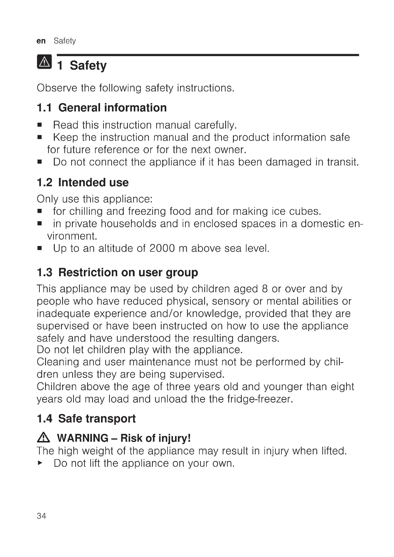 1 Safety Observe the following safety instructions. 1.1 General information ¡ Read this instruction manual carefully. ¡ Keep the instruction manual and the product information safe for future reference or for the next owner. ¡ Do not connect the appliance if it has been damaged in transit. 1.2 Intended use Only use this appliance: ¡ for chilling and freezing food and for making ice cubes. ¡ in private households and in enclosed spaces in a domestic en- vironment. ¡ Up to an altitude of 2000 m above sea level. 1.3 Restriction on user group This appliance may be used by children aged 8 or over and by people who have reduced physical, sensory or mental abilities or inadequate experience and/or knowledge, provided that they are supervised or have been instructed on how to use the appliance safely and have understood the resulting dangers. Do not let children play with the appliance. Cleaning and user maintenance must not be performed by chil- dren unless they are being supervised. Children above the age of three years old and younger than eight years old may load and unload the the fridge-freezer. 1.4 Safe transport WARNING‒Risk of injury! The high weight of the appliance may result in injury when lifted. ▶ Do not lift the appliance on your own.Safety en