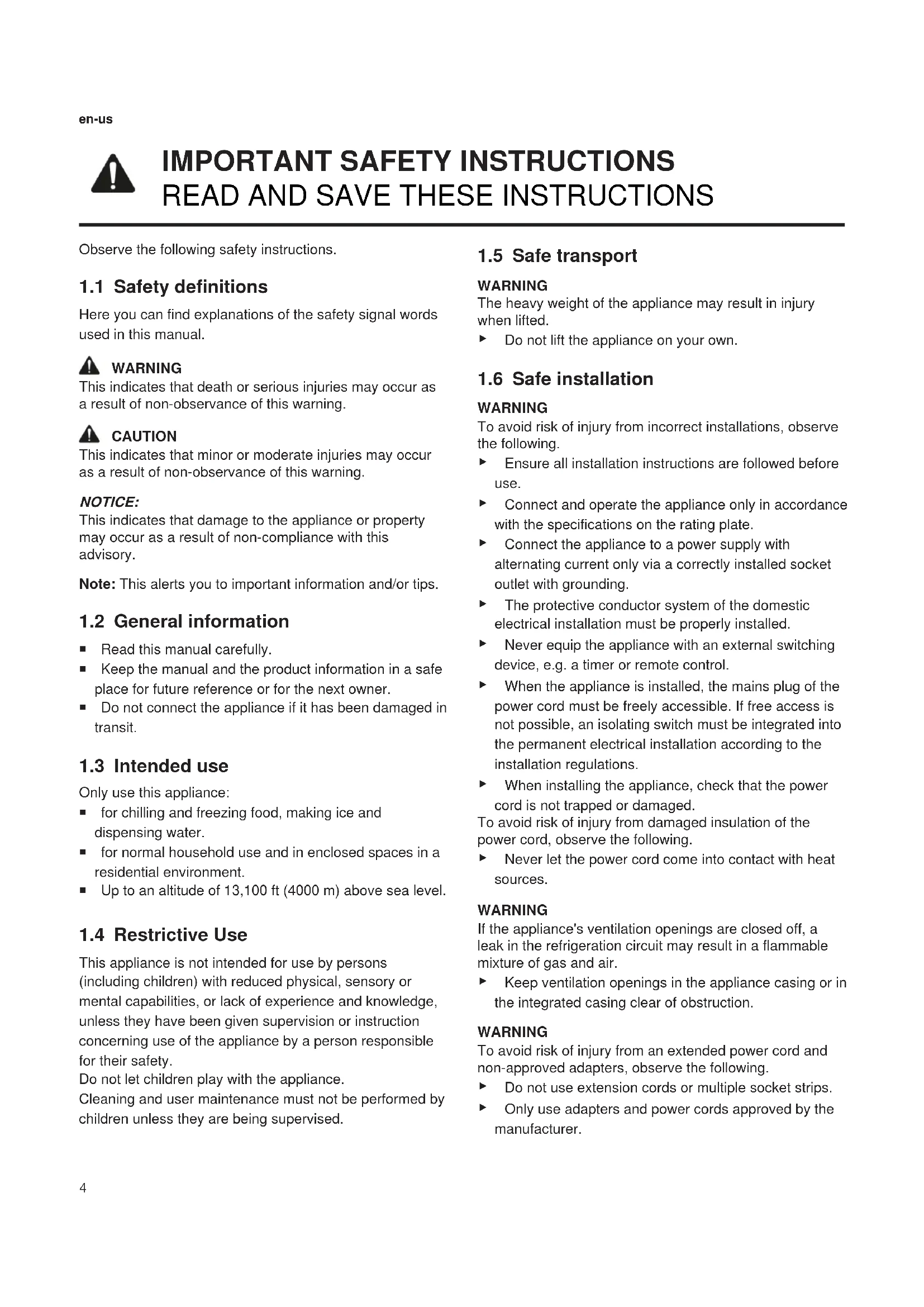 Observe the following safety instructions. 1.1 Safety definitions Here you can find explanations of the safety signal words used in this manual. WARNING This indicates that death or serious injuries may occur as a result of non-observance of this warning. CAUTION This indicates that minor or moderate injuries may occur as a result of non-observance of this warning. NOTICE: This indicates that damage to the appliance or property may occur as a result of non-compliance with this advisory. Note:This alerts you to important information and/or tips. 1.2 General information ¡ Read this manual carefully. ¡ Keep the manual and the product information in a safe place for future reference or for the next owner. ¡ Do not connect the appliance if it has been damaged in transit. 1.3 Intended use Only use this appliance: ¡ for chilling and freezing food, making ice and dispensing water. ¡ for normal household use and in enclosed spaces in a residential environment. ¡ Up to an altitude of 13,100 ft (4000 m) above sea level. 1.4 Restrictive Use This appliance is not intended for use by persons (including children) with reduced physical, sensory or mental capabilities, or lack of experience and knowledge, unless they have been given supervision or instruction concerning use of the appliance by a person responsible for their safety. Do not let children play with the appliance. Cleaning and user maintenance must not be performed by children unless they are being supervised. 1.5 Safe transport WARNING The heavy weight of the appliance may result in injury when lifted. ▶ Do not lift the appliance on your own. 1.6 Safe installation WARNING To avoid risk of injury from incorrect installations, observe the following. ▶ Ensure all installation instructions are followed before use. ▶ Connect and operate the appliance only in accordance with the specifications on the rating plate. ▶ Connect the appliance to a power supply with alternating current only via a correctly installed socket outlet with grounding. ▶ The protective conductor system of the domestic electrical installation must be properly installed. ▶ Never equip the appliance with an external switching device, e.g. a timer or remote control. ▶ When the appliance is installed, the mains plug of the power cord must be freely accessible. If free access is not possible, an isolating switch must be integrated into the permanent electrical installation according to the installation regulations. ▶ When installing the appliance, check that the power cord is not trapped or damaged. To avoid risk of injury from damaged insulation of the power cord, observe the following. ▶ Never let the power cord come into contact with heat sources. WARNING If the appliance's ventilation openings are closed off, a leak in the refrigeration circuit may result in a flammable mixture of gas and air. ▶ Keep ventilation openings in the appliance casing or in the integrated casing clear of obstruction. WARNING To avoid risk of injury from an extended power cord and non-approved adapters, observe the following. ▶ Do not use extension cords or multiple socket strips. ▶ Only use adapters and power cords approved by the manufacturer.