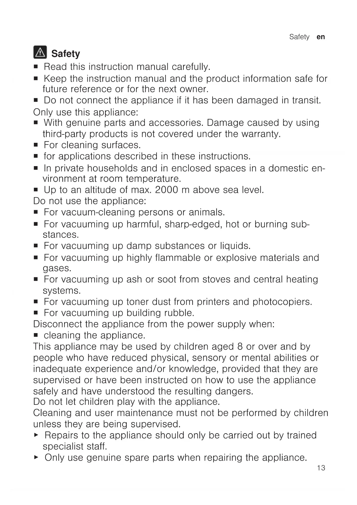 Safety ¡ Read this instruction manual carefully. ¡ Keep the instruction manual and the product information safe for future reference or for the next owner. ¡ Do not connect the appliance if it has been damaged in transit. Only use this appliance: ¡ With genuine parts and accessories. Damage caused by using third-party products is not covered under the warranty. ¡ For cleaning surfaces. ¡ for applications described in these instructions. ¡ In private households and in enclosed spaces in a domestic en- vironment at room temperature. ¡ Up to an altitude of max. 2000m above sea level. Do not use the appliance: ¡ For vacuum-cleaning persons or animals. ¡ For vacuuming up harmful, sharp-edged, hot or burning sub- stances. ¡ For vacuuming up damp substances or liquids. ¡ For vacuuming up highly flammable or explosive materials and gases. ¡ For vacuuming up ash or soot from stoves and central heating systems. ¡ For vacuuming up toner dust from printers and photocopiers. ¡ For vacuuming up building rubble. Disconnect the appliance from the power supply when: ¡ cleaning the appliance. This appliance may be used by children aged 8 or over and by people who have reduced physical, sensory or mental abilities or inadequate experience and/or knowledge, provided that they are supervised or have been instructed on how to use the appliance safely and have understood the resulting dangers. Do not let children play with the appliance. Cleaning and user maintenance must not be performed by children unless they are being supervised. ▶ Repairs to the appliance should only be carried out by trained specialist staff. ▶ Only use genuine spare parts when repairing the appliance.en Safety