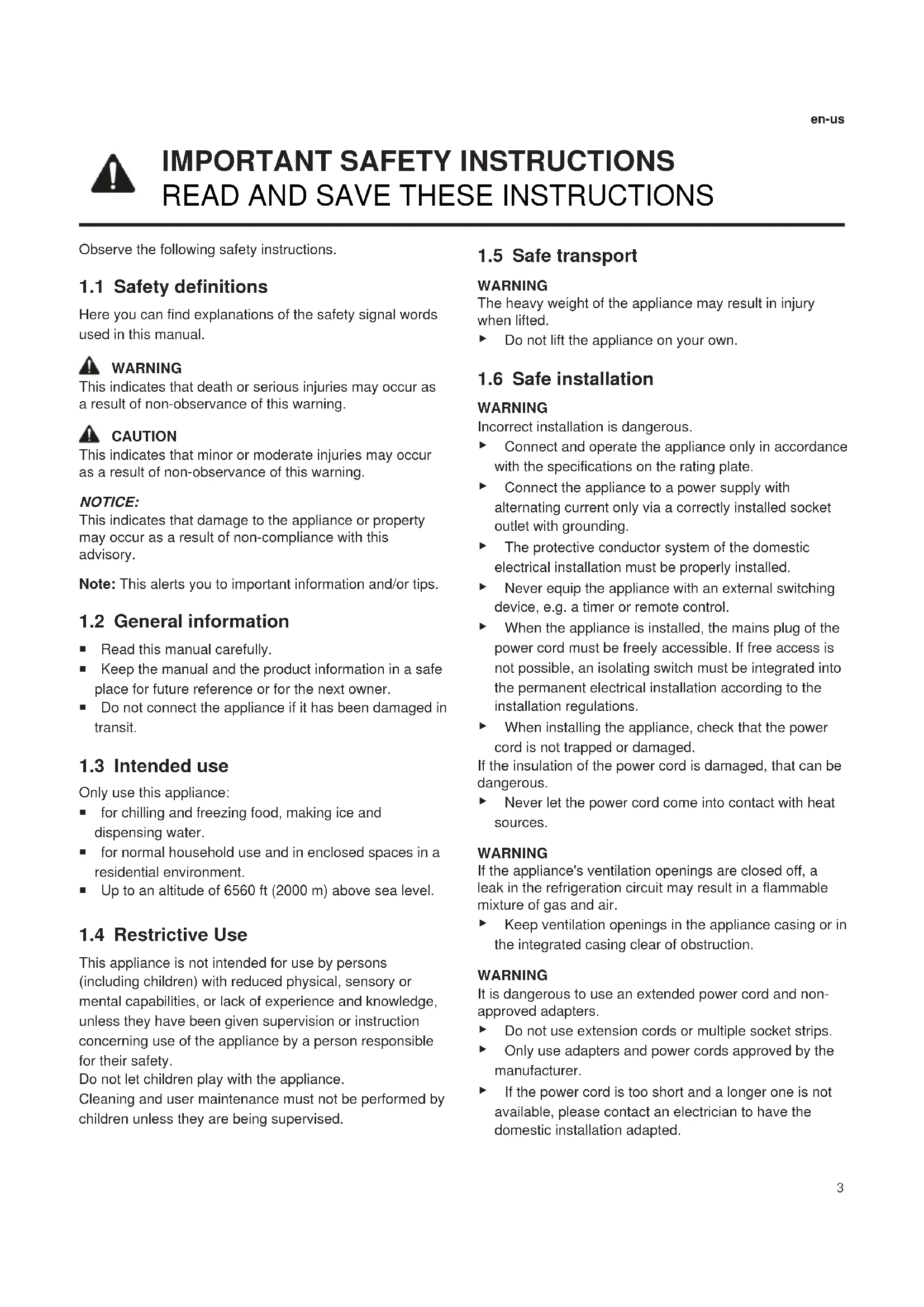 Observe the following safety instructions. 1.1 Safety definitions Here you can find explanations of the safety signal words used in this manual. WARNING This indicates that death or serious injuries may occur as a result of non-observance of this warning. CAUTION This indicates that minor or moderate injuries may occur as a result of non-observance of this warning. NOTICE: This indicates that damage to the appliance or property may occur as a result of non-compliance with this advisory. Note:This alerts you to important information and/or tips. 1.2 General information ¡ Read this manual carefully. ¡ Keep the manual and the product information in a safe place for future reference or for the next owner. ¡ Do not connect the appliance if it has been damaged in transit. 1.3 Intended use Only use this appliance: ¡ for chilling and freezing food, making ice and dispensing water. ¡ for normal household use and in enclosed spaces in a residential environment. ¡ Up to an altitude of 6560ft (2000m) above sea level. 1.4 Restrictive Use This appliance is not intended for use by persons (including children) with reduced physical, sensory or mental capabilities, or lack of experience and knowledge, unless they have been given supervision or instruction concerning use of the appliance by a person responsible for their safety. Do not let children play with the appliance. Cleaning and user maintenance must not be performed by children unless they are being supervised. 1.5 Safe transport WARNING The heavy weight of the appliance may result in injury when lifted. ▶ Do not lift the appliance on your own. 1.6 Safe installation WARNING Incorrect installation is dangerous. ▶ Connect and operate the appliance only in accordance with the specifications on the rating plate. ▶ Connect the appliance to a power supply with alternating current only via a correctly installed socket outlet with grounding. ▶ The protective conductor system of the domestic electrical installation must be properly installed. ▶ Never equip the appliance with an external switching device, e.g. a timer or remote control. ▶ When the appliance is installed, the mains plug of the power cord must be freely accessible. If free access is not possible, an isolating switch must be integrated into the permanent electrical installation according to the installation regulations. ▶ When installing the appliance, check that the power cord is not trapped or damaged. If the insulation of the power cord is damaged, that can be dangerous. ▶ Never let the power cord come into contact with heat sources. WARNING If the appliance's ventilation openings are closed off, a leak in the refrigeration circuit may result in a flammable mixture of gas and air. ▶ Keep ventilation openings in the appliance casing or in the integrated casing clear of obstruction. WARNING It is dangerous to use an extended power cord and non- approved adapters. ▶ Do not use extension cords or multiple socket strips. ▶ Only use adapters and power cords approved by the manufacturer. ▶ If the power cord is too short and a longer one is not available, please contact an electrician to have the domestic installation adapted.