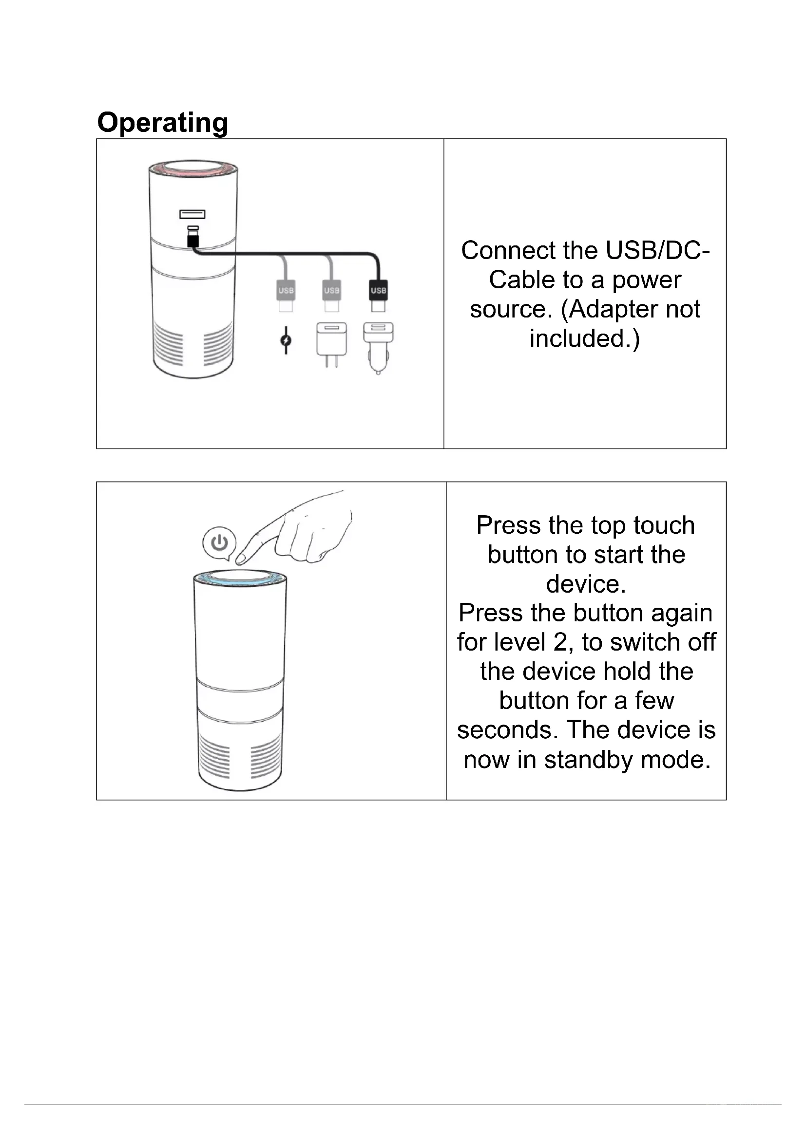 Press the top touch button to start the device. Press the button again for level 2, to switch off the device hold the button for a few seconds. The device is now in standby mode.Replace the HEPA-Filter