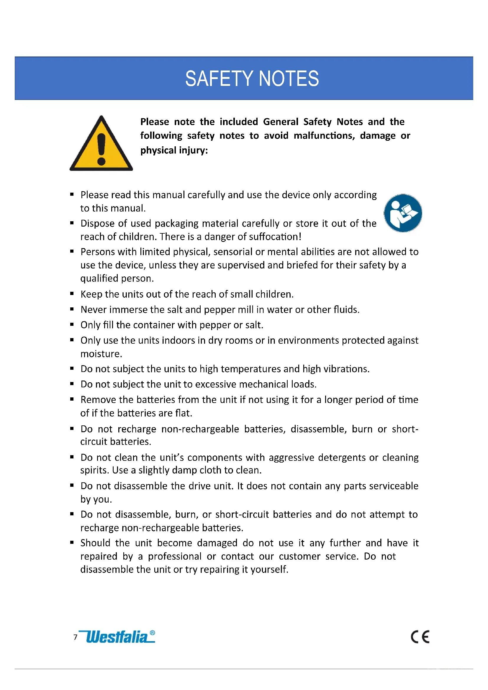 Please read this manual carefully and use the device only according to this manual. Dispose of used packaging material carefully or store it out of the reach of children. There is a danger of suffocation! Persons with limited physical, sensorial or mental abilities are not allowed to use the device, unless they are supervised and briefed for their safety by a qualified person. Keep the units out of the reach of small children. Never immerse the salt and pepper mill in water or other fluids. Only fill the container with pepper or salt. Only use the units indoors in dry rooms or in environments protected against moisture. Do not subject the units to high temperatures and high vibrations. Do not subject the unit to excessive mechanical loads. Remove the batteries from the unit if not using it for a longer period of time of if the batteries are flat. Do not recharge non-rechargeable batteries, disassemble, burn or short- circuit batteries. Do not clean the unit’s components with aggressive detergents or cleaning spirits. Use a slightly damp cloth to clean. Do not disassemble the drive unit. It does not contain any parts serviceable by you. Do not disassemble, burn, or short-circuit batteries and do not attempt to recharge non-rechargeable batteries. Should the unit become damaged do not use it any further and have it repaired by a professional or contact our customer service. Do not disassemble the unit or try repairing it yourself. SAFETY NOTES8