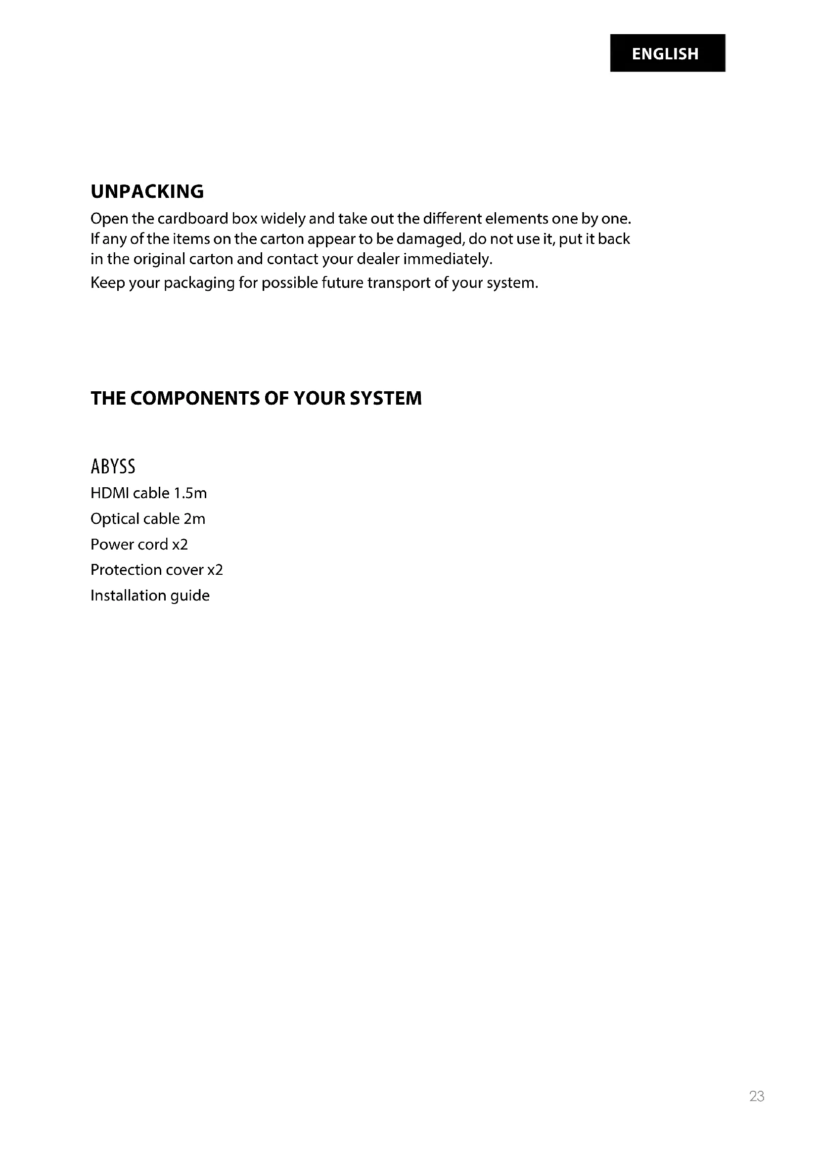 FRANÇAIS22 User guideUNPACKING Open the cardboard box widely and take out the dierent elements one by one. If any of the items on the carton appear to be damaged, do not use it, put it back in the original carton and contact your dealer immediately. Keep your packaging for possible future transport of your system.