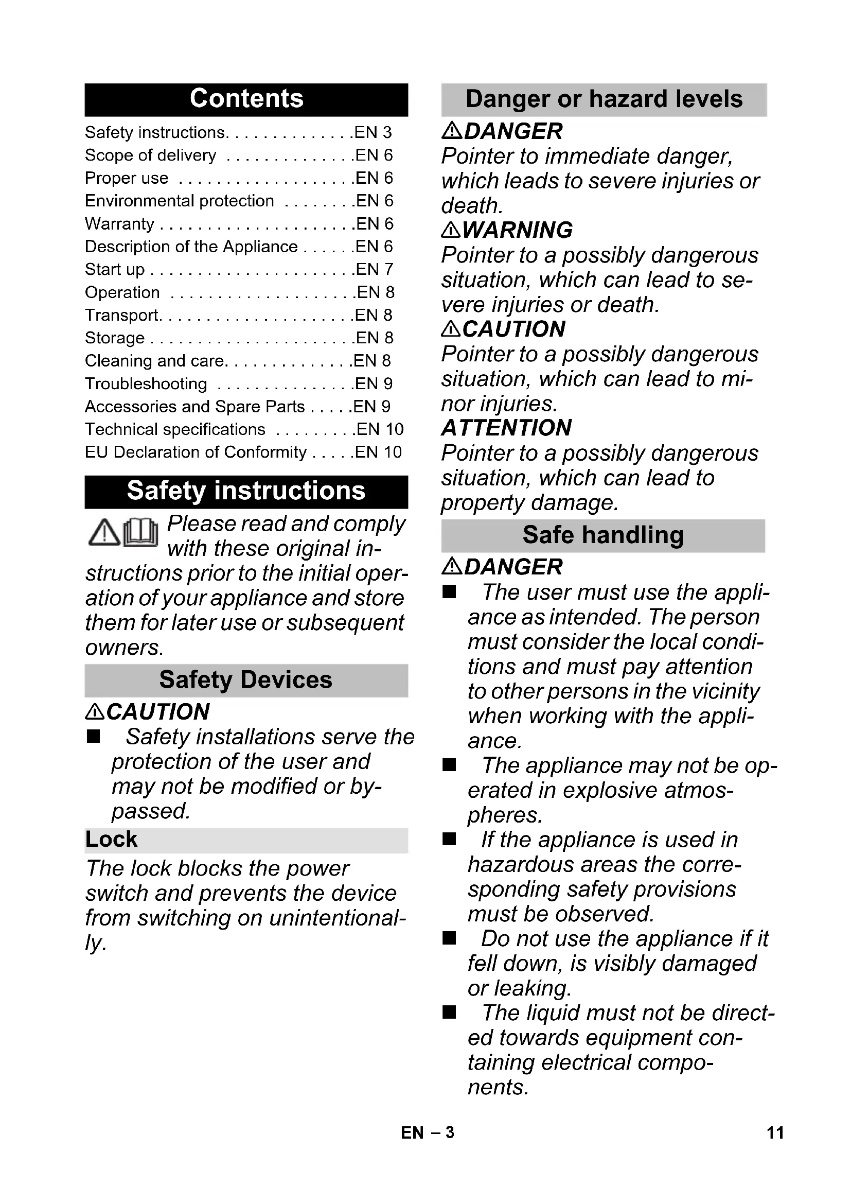 - °C Lagertemperatur -20 °C Gewicht 0,5 kg Abmessungen (L x B x H) 133 x 88 x 50 mm Standard Ladegerät BC 18 V Nennspannung 100-240 V Frequenz 50-60 Hz Stromaufnahme (max.) 0,3 A Schutzklasse II Nennspannung Akkupack 18 V = Ladestrom (max.) 0,5 A Ladezeit (bei leerem Akkupack) ca. 4 h Gewicht (ohne Akkupack) 0,16 kg EU-Konformitätserklärung Produkt: Druckreiniger (akkubetrieben) Typ: 1.328-000 1.328-1xx Einschlägige EU-Richtlinien 2014/35/EU 2014/35/EU 2014/30/EU 2014/30/EU 2011/65/EU 2011/65/EU 2000/14/EG – Angewandte harmonisierte Normen EN 60335–1 EN 60335–1 – EN 60335-2-29 EN 60335–2–54 EN 60335–2–54 EN 62233: 2008 EN 62233: 2008 EN 55014–1:2017 EN 55014–1:2017 EN 55014–2: 2015 EN 55014–2: 2015 – EN 61000–3–2: 2014 – EN 61000–3–3: 2013 EN 50581 EN 50581 Angewandtes Konformitätsbewertungsverfahren 2000/14/EG: Anhang V Schallleistungspegel dB(A) Gemessen: 82 Garantiert: 84 Chairman of the Board of Management Director Regulatory Affairs & Certification 10 DE– 3 Please read and comply with these original in- structions prior to the initial oper- ation of your appliance and store them for later use or subsequent owners. 몇 CAUTION Safety installations serve the protection of the user and may not be modified or by- passed. The lock blocks the power switch and prevents the device from switching on unintentional- ly. DANGER Pointer to immediate danger, which leads to severe injuries or death. 몇 WARNING Pointer to a possibly dangerous situation, which can lead to se- vere injuries or death. 몇 CAUTION Pointer to a possibly dangerous situation, which can lead to mi- nor injuries. ATTENTION Pointer to a possibly dangerous situation, which can lead to property damage. DANGER The user must use the appli- ance as intended. The person must consider the local condi- tions and must pay attention to other persons in the vicinity when working with the appli- ance. The appliance may not be op- erated in explosive atmos- pheres. If the appliance is used in hazardous areas the corre- sponding safety provisions must be observed. Do not use the appliance if it fell down, is visibly damaged or leaking. The liquid must not be direct- ed towards equipment con- taining electrical compo- nents. Contents Safety instructions EN 3 Scope of delivery EN 6 Proper use EN 6 Environmental protection EN 6 Warranty EN 6 Description of the Appliance EN 6 Start up EN 7 Operation EN 8 Transport EN 8 Storage EN 8 Cleaning and care EN 8 Troubleshooting EN 9 Accessories and Spare Parts EN 9 Technical specifications EN 10 EU Declaration of Conformity EN 10 Safety instructions Safety Devices Lock Danger or hazard levels Safe handling 11EN– 4 Never use the appliance to clean objects containing haz- ardous substances (e.g. as- bestos). 몇 WARNING The appliance must not be operated by children or per- sons who have not been in- structed accordingly. This appliance is not intended for use by persons with limit- ed physical, sensory or men- tal capacities or lacking expe- rience and/or skills, unless such persons are accompa- nied and supervised by a per- son in charge of their safety or they have received precise instructions on the use of this appliance and have under- stood the resulting risks. Children must not play with this appliance. Supervise children to prevent them from playing with the appliance. Operate or store the appli- ance only in accordance with the description or illustration! Never direct the jet at people, animals or loose objects! The appliance contains elec- trical components - do not clean under running water. According to applicable regu- lations, the device must never be used with the drinking wa- ter network without a system separator. Ensure that the connection to your house wa- ter system, with which the de- vice is operated, is equipped with a system separator ac- cording to EN 12729 type BA. Water that has flown through a system separator is no longer classified as drinking water. 몇 CAUTION Dry running may damage the device. Never leave the appliance unattended as long as it is in operation. ATTENTION Do not operate the appliance at temperatures below 0 °C. Symbols on the machine The appliance must not be directly connected to the public drinking water network. 12 EN– 5 DANGER Check the plug-in power sup- ply, connection cable, battery adapter and battery pack for damage before every use. Damaged devices may no longer be used and must be replaced. Do not open the charger. The charger must be replaced if damaged or defect. Do not operate the charger in explosive environment. Never touch the mains plug and the socket with wet hands. Do not use the charger if dirty or wet. Do not charge battery (prima- ry cells); risk of explosion. 몇 CAUTION The mains voltage must match the voltage mentioned on the type plate of the charg- er. Use the charger only to charge approved battery packs. Only charge the battery pack using the original charger en- closed or with a charger ap- proved by KÄRCHER. ATTENTION Do no carry charger by the connection cable. Keep connection cable away from heat, sharp edges, oil and moving parts. Do not cover the plug-in pow- er supply. Avoid extension cables with multiple sockets and simulta- neous operation of several devices. Do not wind the connection cable around the or the bat- tery adapter to avoid damag- es. Be sure to read the safety in- structions enclosed with the battery pack and observe these during use! Charger safety instructions Symbols on the charger Protect the charger against moisture and store it dry. The device is only suitable for use in rooms; do not expose the device to rain. The charger has a built-in fuse of 1 ampere. The charger meets the requirements of protec- tive class II. Battery pack safety instructions 13EN– 6 The scope of delivery of your appliance is illustrated on the packaging. Check the contents of the appliance for completeness when unpacking. In the event of missing accessories or any transp