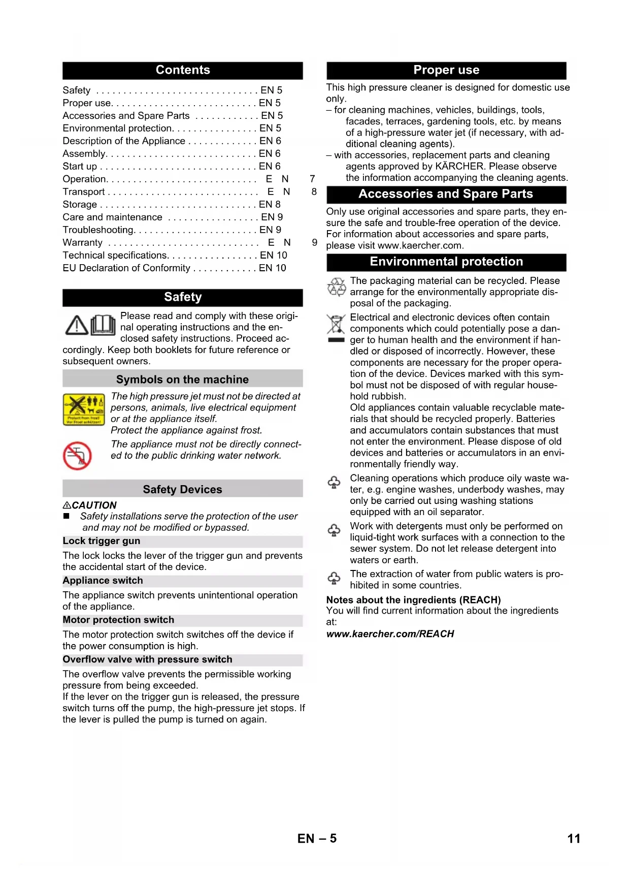 95 dB(A) Ausnahmegrund nach Verordnung (EU) 2019/1781 Anhang I Abschnitt 2 (12): j) Technische Änderungen vorbehalten. EU-Konformitätserklärung Produkt: Hochdruckreiniger Typ: K 6 Special Einschlägige EU-Richtlinien 2006/42/EG (+2009/127/EG) 2014/30/EU 2011/65/EU 2000/14/EG 2009/125/EG Angewandte Verordnung(en) (EU) 2019/1781 Angewandte harmonisierte Normen EN 60335–1 EN 60335–2–79 EN 62233: 2008 EN 55014–1: 2017 + A11: 2020 EN 55014–2: 2015 EN 61000–3–2: 2014 EN 61000–3–11: 2000 EN IEC 63000: 2018 Angewandtes Konformitätsbewertungsverfahren 2000/14/EG: Anhang V Schallleistungspegel dB(A) Gemessen: 92 Garantiert: 95 Winnenden, 2021/06/01 Chairman of the Board of Management Director Regulatory Affairs & Certification 10 DE– 5 Please read and comply with these origi- nal operating instructions and the en- closed safety instructions. Proceed ac- cordingly. Keep both booklets for future reference or subsequent owners. 몇 CAUTION Safety installations serve the protection of the user and may not be modified or bypassed. The lock locks the lever of the trigger gun and prevents the accidental start of the device. The appliance switch prevents unintentional operation of the appliance. The motor protection switch switches off the device if the power consumption is high. The overflow valve prevents the permissible working pressure from being exceeded. If the lever on the trigger gun is released, the pressure switch turns off the pump, the high-pressure jet stops. If the lever is pulled the pump is turned on again. This high pressure cleaner is designed for domestic use only. – for cleaning machines, vehicles, buildings, tools, facades, terraces, gardening tools, etc. by means of a high-pressure water jet (if necessary, with ad- ditional cleaning agents). – with accessories, replacement parts and cleaning agents approved by KÄRCHER. Please observe the information accompanying the cleaning agents. Only use original accessories and spare parts, they en- sure the safe and trouble-free operation of the device. For information about accessories and spare parts, please visit www.kaercher.com. Notes about the ingredients (REACH) You will find current information about the ingredients at: www.kaercher.com/REACH Contents Safety ... EN 5 Proper use... EN 5 Accessories and Spare Parts ... EN 5 Environmental protection... EN 5 Description of the Appliance ... EN 6 Assembly... EN 6 Start up ... EN 6 Operation...EN 7 Transport ...EN 8 Storage ... EN 8 Care and maintenance ... EN 9 Troubleshooting... EN 9 Warranty ...EN 9 Technical specifications... EN 10 EU Declaration of Conformity ... EN 10 Safety Symbols on the machine The high pressure jet must not be directed at persons, animals, live electrical equipment or at the appliance itself. Protect the appliance against frost. The appliance must not be directly connect- ed to the public drinking water network. Safety Devices Lock trigger gun Appliance switch Motor protection switch Overflow valve with pressure switch Proper use Accessories and Spare Parts Environmental protection The packaging material can be recycled. Please arrange for the environmentally appropriate dis- posal of the packaging. Electrical and electronic devices often contain components which could potentially pose a dan- ger to human health and the environment if han- dled or disposed of incorrectly. However, these components are necessary for the proper opera- tion of the device. Devices marked with this sym- bol must not be disposed of with regular house- hold rubbish. Old appliances contain valuable recyclable mate- rials that should be recycled properly. Batteries and accumulators contain substances that must not enter the environment. Please dispose of old devices and batteries or accumulators in an envi- ronmentally friendly way. Cleaning operations which produce oily waste wa- ter, e.g. engine washes, underbody washes, may only be carried out using washing stations equipped with an oil separator. Work with detergents must only be performed on liquid-tight work surfaces with a connection to the sewer system. Do not let release detergent into waters or earth. The extraction of water from public waters is pro- hibited in some countries. 11EN– 6 The scope of delivery of your appliance is illustrated on the packaging. Check the contents of the appliance for completeness when unpacking. In the event of missing accessories or any transport damage, please contact your dealer. Illustrations on Page 2 1 Water connection with integrated sieve 2 Coupling element for water connection 3 Quick coupling for high pressure hose 4 Storage for trigger gun 5 Appliance switch „0/OFF“ / „I/ON“ 6 Dosage regulator for detergent 7 Storage for trigger gun 8 Transport handle 9 Plug 'n' Clean detergent bottle with locking lid 10 Storage of Plug 'n' Clean detergent bottle with de- tergent connection 11 Storage for high pressure hose 12 Storage for spray lance 13 Storage hook for mains connection cable 14 Mains cable with mains plug 15 Bearing wheel 16 Trigger gun 17 Lock trigger gun 18 Button for detaching the high-pressure hose from the trigger gun 19 High pressure hose 20 Spray lance with Dirtblaster For strong contaminations. 21 Spray lance with pressure regulation (Vario Power) Carrying out the most common cleaning tasks. The working pressure can be continuously in- creased from "SOFT" to "HARD". To adjust the working pressure, release the trigger gun lever and turn the spray lance to the desired position. Suitable for use with detergents. Illustrations on fold-out pages! Mount loose parts delivered with appliance prior to start- up. Illustration Place the bottom holder into the recesses and push forward until it audibly locks in. Illustration Insert the top holder and push down all the way. Illustration Press in the storage hook and lock it into the top po- sition. You will need the 2 included screws as well as a Phillips screwdriver PH 2. Illustration Insert both detergent