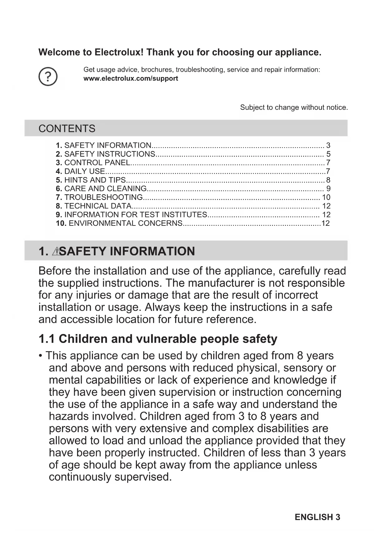 - This appliance can be used by children aged from 8 years and above and persons with reduced physical, sensory or mental capabilities or lack of experience and knowledge if they have been given supervision or instruction concerning the use of the appliance in a safe way and understand the hazards involved. Children aged from 3 to 8 years and persons with very extensive and complex disabilities are allowed to load and unload the appliance provided that they have been properly instructed. Children of less than 3 years of age should be kept away from the appliance unless continuously supervised. ENGLISH 3• Children should be supervised to ensure that they do not play with the appliance.