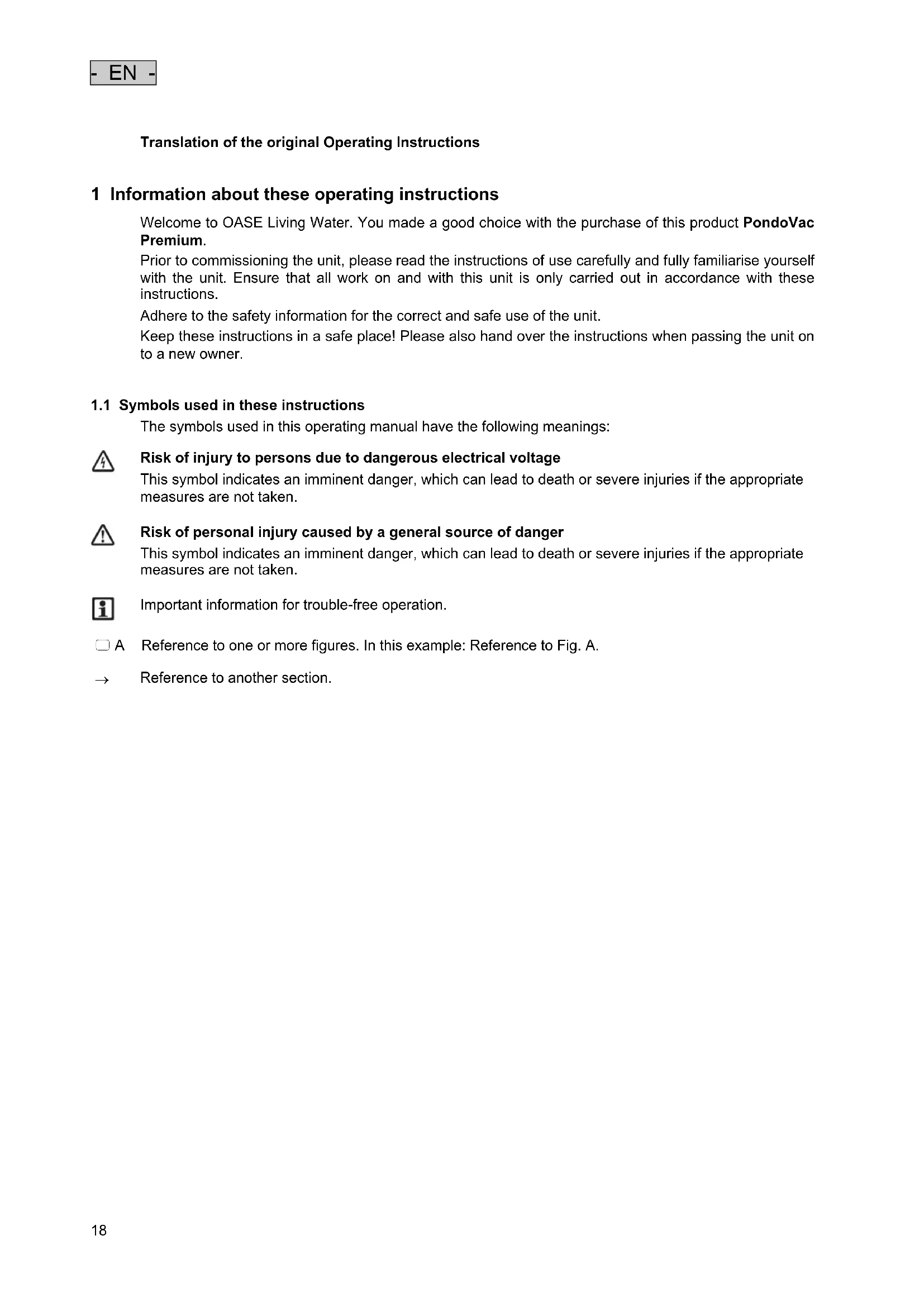 1 Information about these operating instructions Welcome to OASE Living Water. You made a good choice with the purchase of this product PondoVac Premium. Prior to commissioning the unit, please read the instructions of use carefully and fully familiarise yourself with the unit. Ensure that all work on and with this unit is only carried out in accordance with these instructions. Adhere to the safety information for the correct and safe use of the unit. Keep these instructions in a safe place! Please also hand over the instructions when passing the unit on to a new owner.