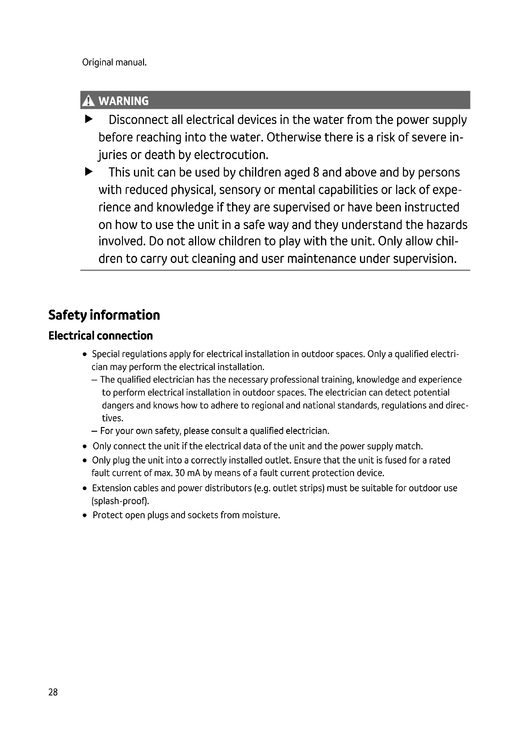 WARNING WARNING Disconnect all electrical devices in the water from the power supply before reaching into the water. Otherwise there is a risk of severe in- juries or death by electrocution. This unit can be used by children aged 8 and above and by persons with reduced physical, sensory or mental capabilities or lack of expe- rience and knowledge if they are supervised or have been instructed on how to use the unit in a safe way and they understand the hazards involved. Do not allow children to play with the unit. Only allow chil- dren to carry out cleaning and user maintenance under supervision. Safety information Electrical connection Special regulations apply for electrical installation in outdoor spaces. Only a qualified electri- cian may perform the electrical installation. – The qualified electrician has the necessary professional training, knowledge and experience to perform electrical installation in outdoor spaces. The electrician can detect potential dangers and knows how to adhere to regional and national standards, regulations and direc- tives. – For your own safety, please consult a qualified electrician. Only connect the unit if the electrical data of the unit and the power supply match. Only plug the unit into a correctly installed outlet. Ensure that the unit is fused for a rated fault current of max. 30 mA by means of a fault current protection device. Extension cables and power distributors (e.g. outlet strips) must be suitable for outdoor use (splash-proof). Protect open plugs and sockets from moisture.EN