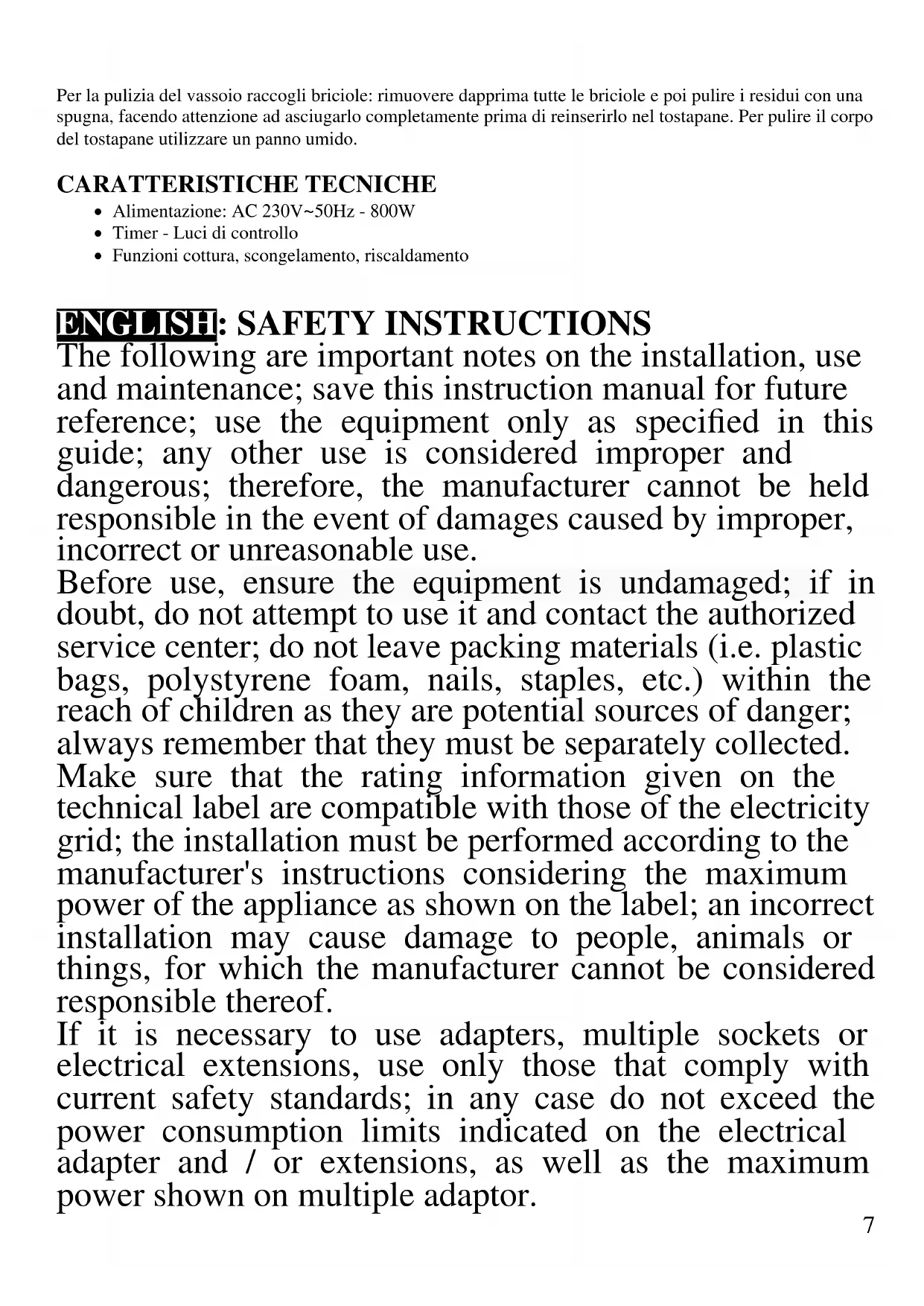 The following are important notes on the installation, use and maintenance; save this instruction manual for future reference; use the equipment only as specified in this guide; any other use is considered improper and dangerous; therefore, the manufacturer cannot be held responsible in the event of damages caused by improper, incorrect or unreasonable use. Before use, ensure the equipment is undamaged; if in doubt, do not attempt to use it and contact the authorized service center; do not leave packing materials (i.e. plastic bags, polystyrene foam, nails, staples, etc.) within the reach of children as they are potential sources of danger; always remember that they must be separately collected. Make sure that the rating information given on the technical label are compatible with those of the electricity grid; the installation must be performed according to the manufacturer's instructions considering the maximum power of the appliance as shown on the label; an incorrect installation may cause damage to people, animals or things, for which the manufacturer cannot be considered responsible thereof. If it is necessary to use adapters, multiple sockets or electrical extensions, use only those that comply with current safety standards; in any case do not exceed the power consumption limits indicated on the electrical adapter and / or extensions, as well as the maximum power shown on multiple adaptor.8 Do not leave the unit plugged; better to remove the plug from the mains when the device is not in use. Always disconnect from power supply if you leave it unattended. Cleaning operations should be carried out after unplugging the unit. If the unit is out of order and you do not want to fix it, it must be made inoperable by cutting power cord. - Do not allow the power cord to get closer to sharp objects or in contact with hot surfaces; do not pull it to disconnect the plug. - Do not use the appliance in the event of damage to the power cord, plug, or in case of short circuits; to repair the product only address an authorized service center. - Do not handle or touch the appliance with wet hands or bare feet. Do not expose the appliance to harmful weather conditions such as rain, moisture, frost, etc.. Always store it in a dry place. - This appliance can be used by children of 8 years and above and persons with reduced physical, sensory or mental capabilities or lack of experience and knowledge if they received supervision or instruction concerning use of the appliance in a safe way and understand hazards involved; children shall not play with the appliance; cleaning and user maintenance shall not be made by children without supervision. - Children must not play with the appliance. - Keep the appliance and its cord out of reach of children less than 8 years. If the power cord is damaged, or in case of failure and / or malfunction do not tamper with the unit. The reparation must be done by manufacturer or by service center authorized by the manufacturer in order to prevent any risk. Failure to comply with the above may compromise the unit safety and invalidate the warranty. - Use original spare parts and accessories only.9