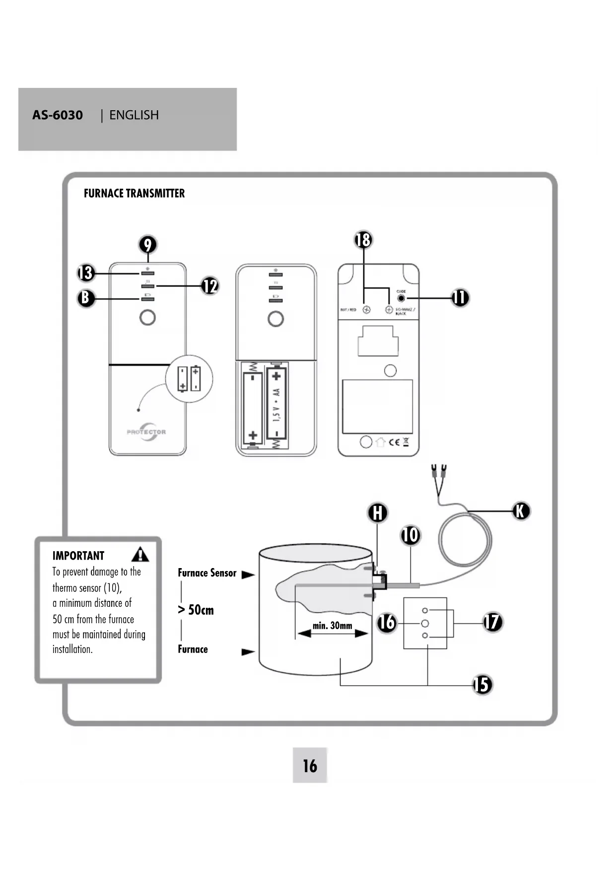 Furnace SensorFurnace > 50cm IMPORTANTTo prevent damage to the thermo sensor (10), a minimum distance of 50 cm from the furnace must be maintained during installation.ENGLISH | AS-6030