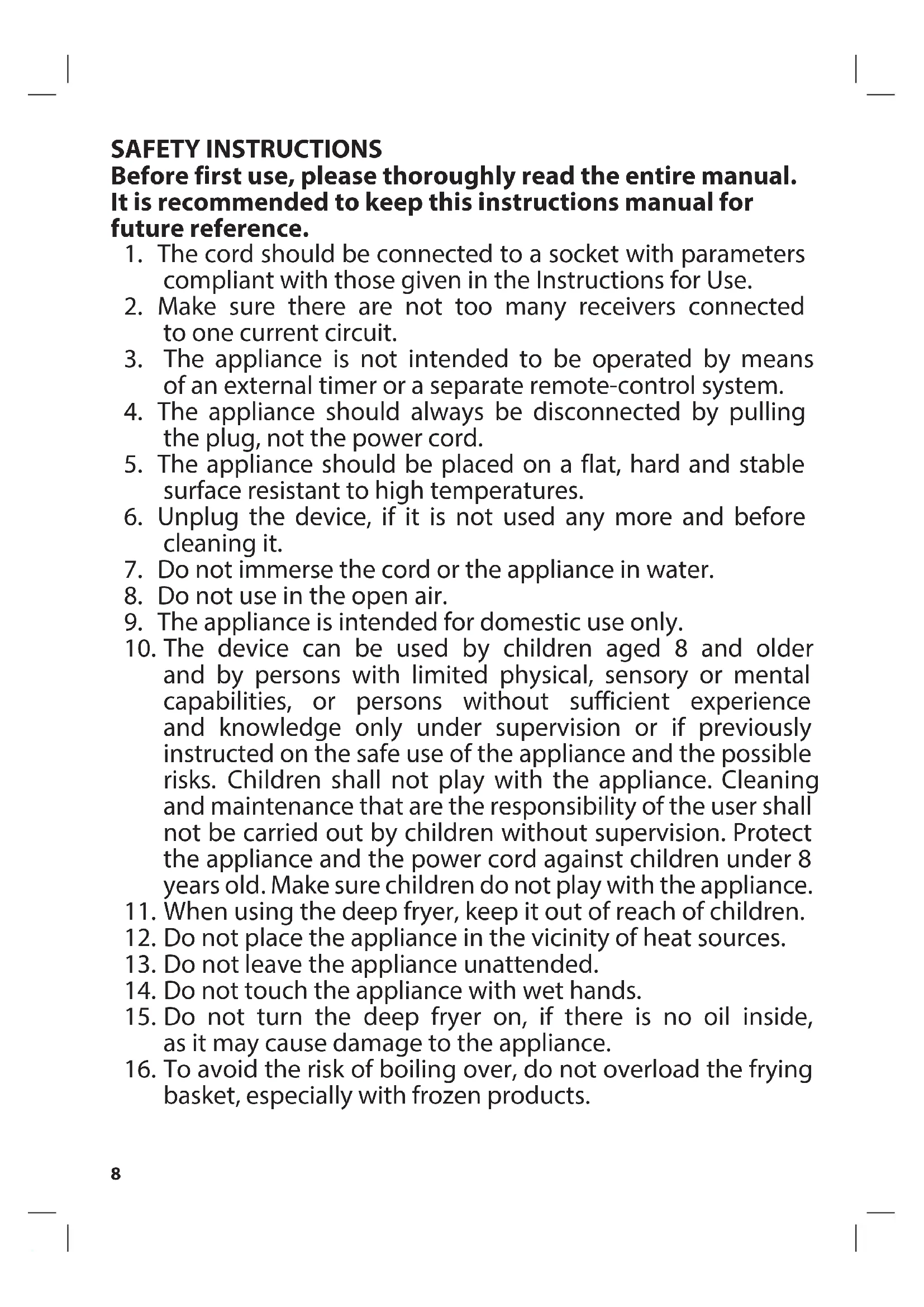 - WARRANTY - This appliance is designed for domestic use only. - It cannot be used for professional purposes or for other than the intended use. - Improper use will nullify the guarantee.9 SAFETY INSTRUCTIONS Before first use, please thoroughly read the entire manual. It is recommended to keep this instructions manual for future reference.